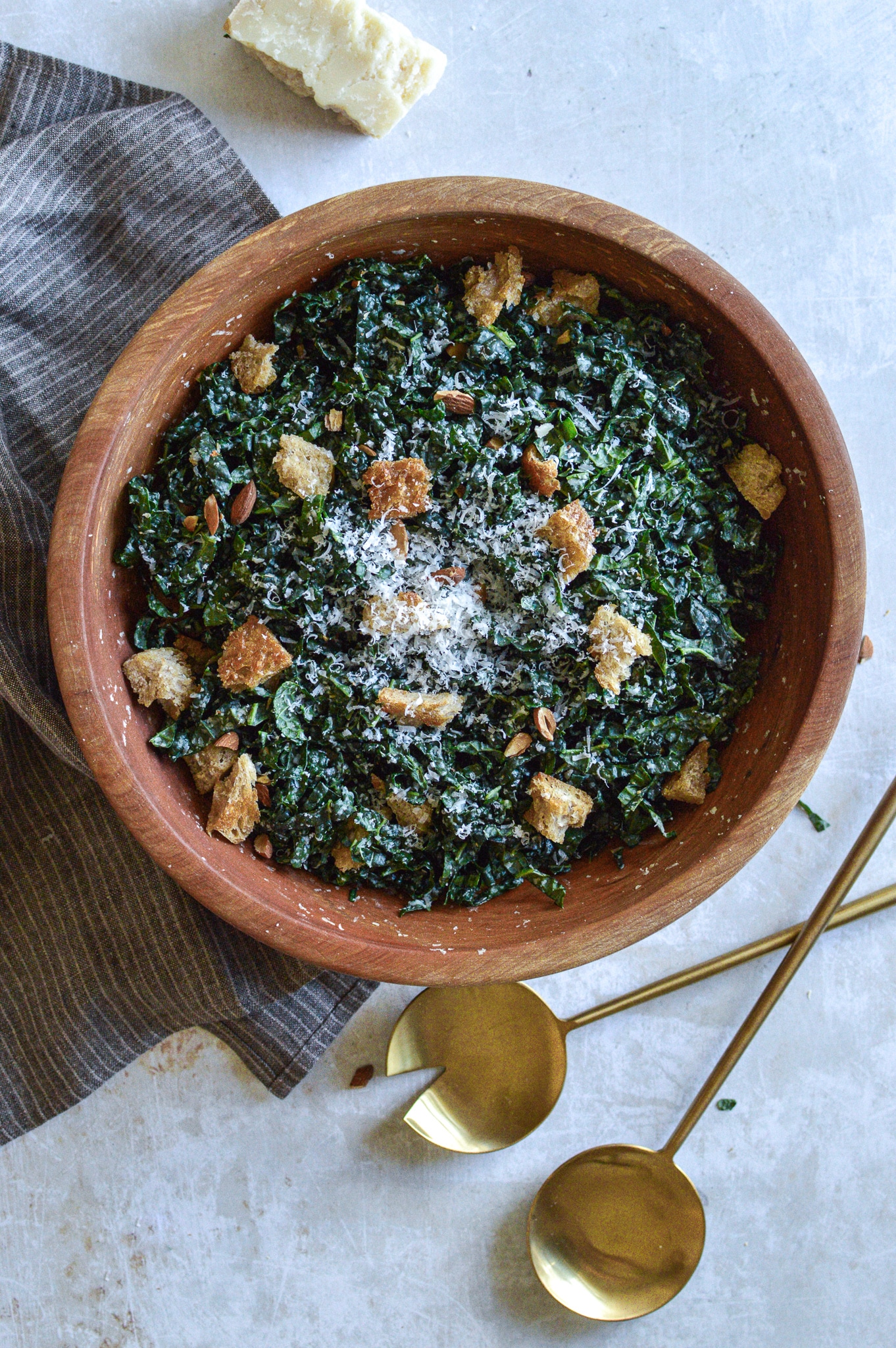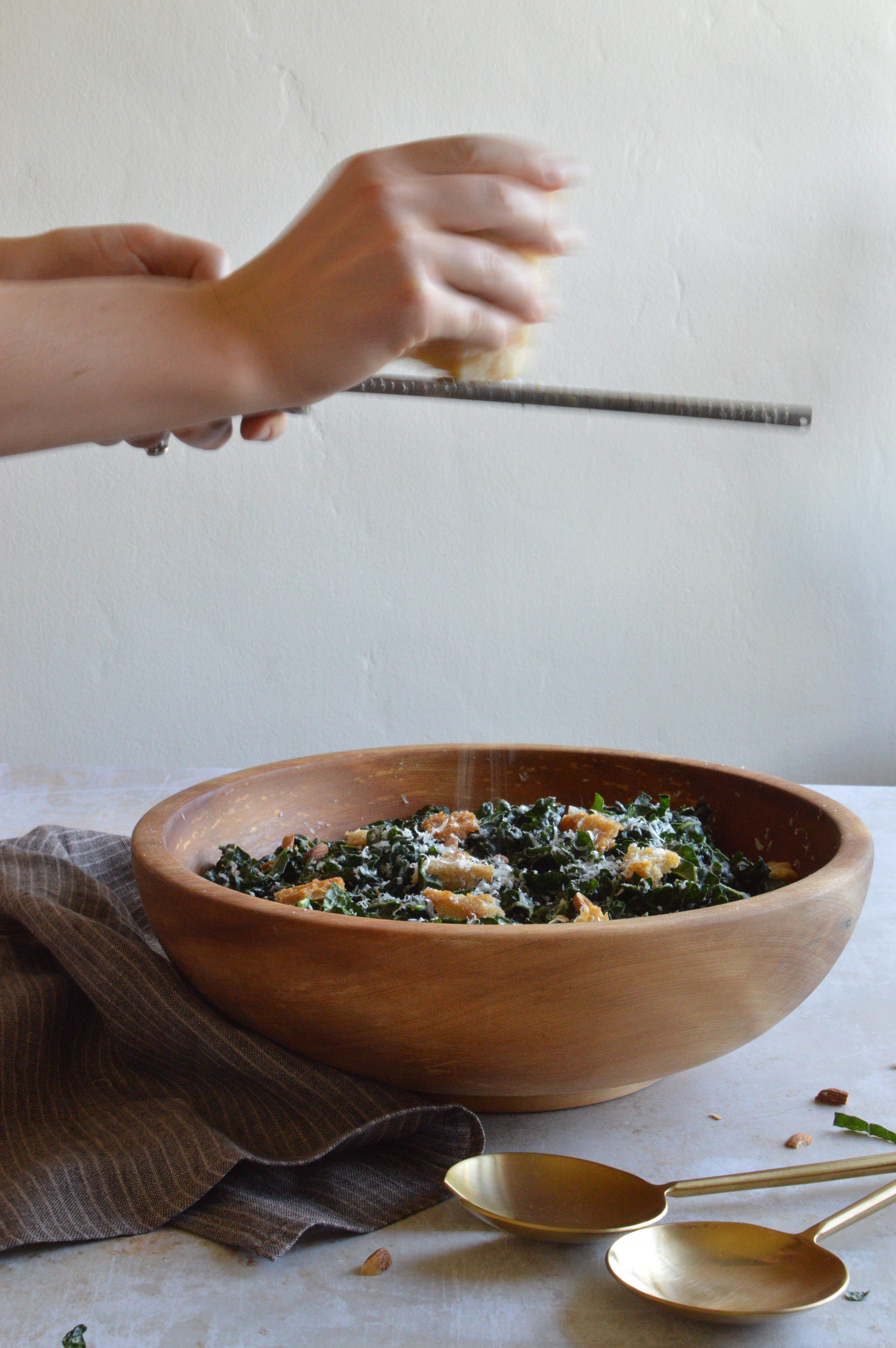 To assemble: grate enough parmesan cheese over the kale to lightly cover each piece of kale (no, I am not joking. You’ll thank me later). Toss and grate until everything is sufficiently coated in cheese. Add your croutons (and/or chopped roasted almonds) to the cheesy kale. Drizzle with 3/4 of the dressing and toss. Add more dressing if necessary.