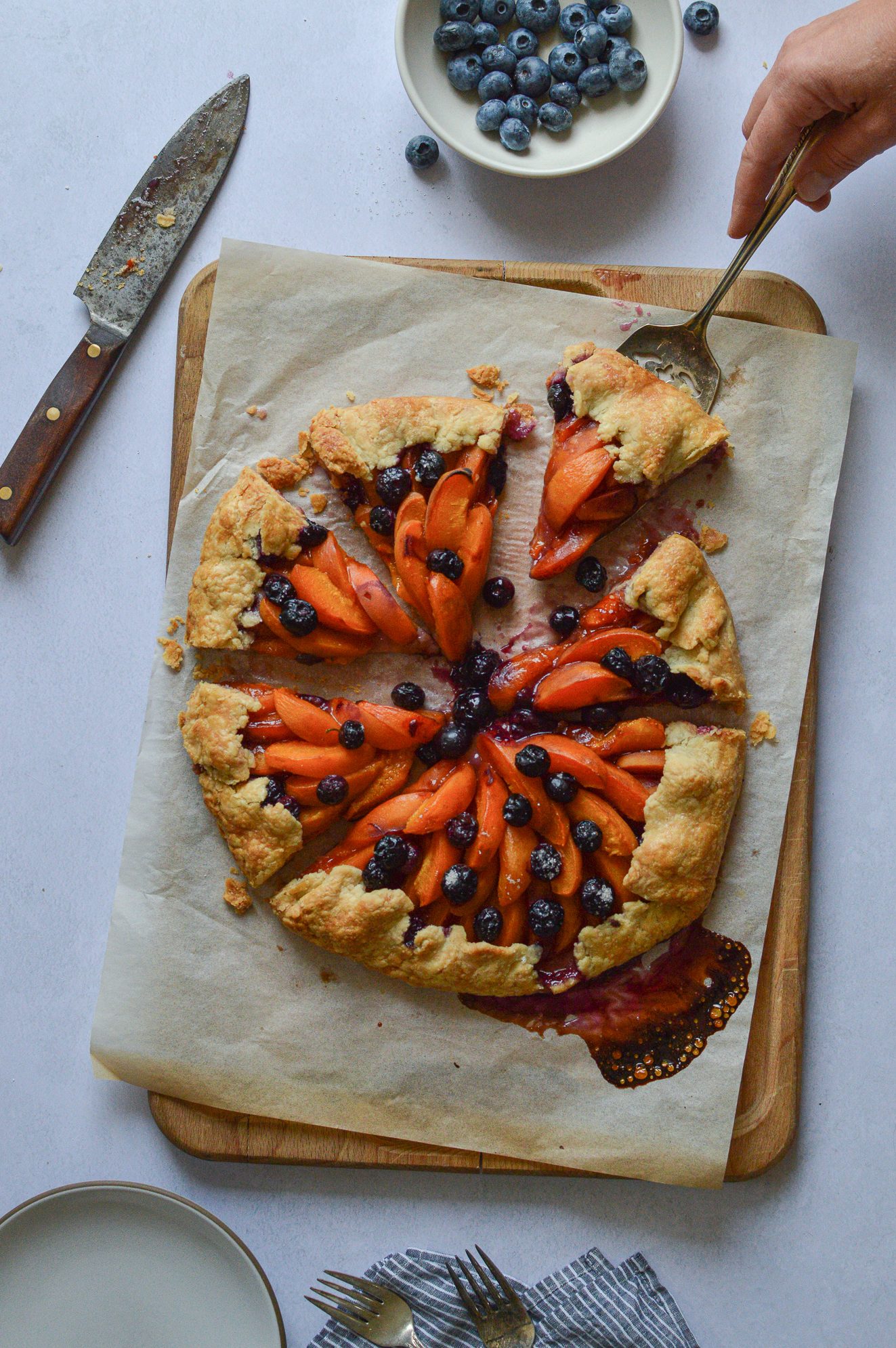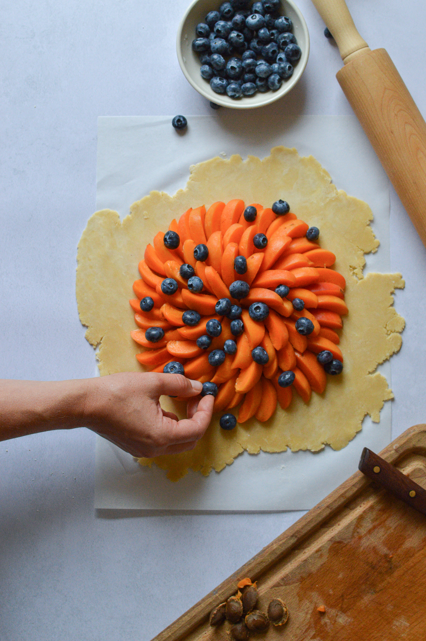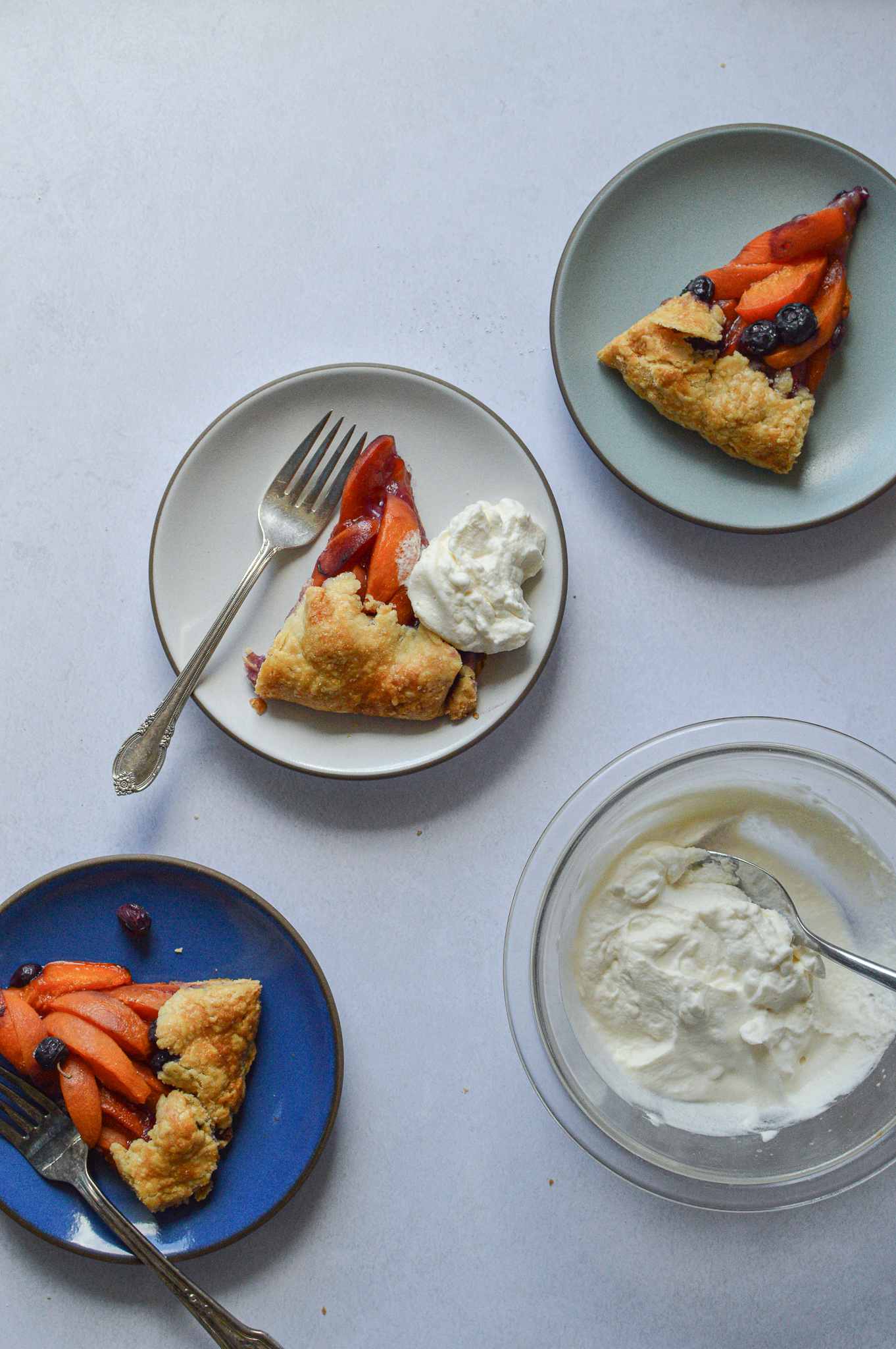 Inspired by the fruit and my constant desire for dessert, I made a little galette. Blueberries joined the nectarines and apricots in mine, but feel free to substitute any stone fruit in place of the ones I used.