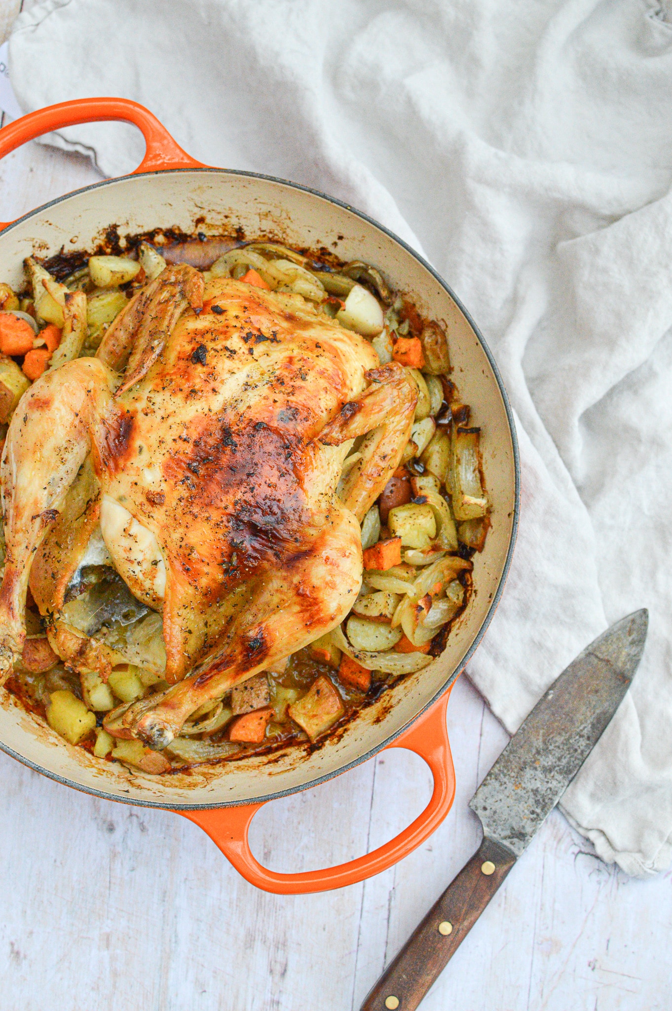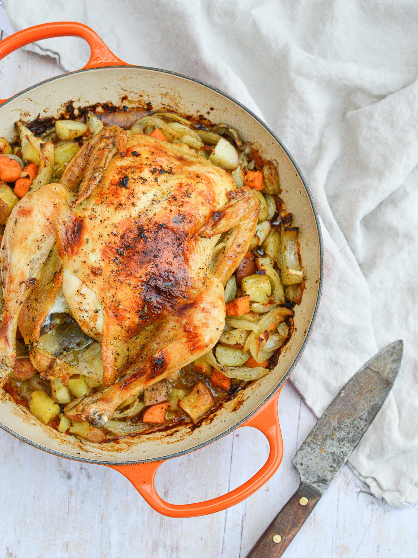 Place the baking dish in the oven and bake for 30 minutes. Turn the oven down to 400°F and bake the chicken, breast-side up this time, for another 30 – 35 minutes, until the skin is crispy and golden brown. Stir the potatoes before placing them in the oven for the last 30 minutes. (Your total cooking time will be 1 hour and 30 minutes.)