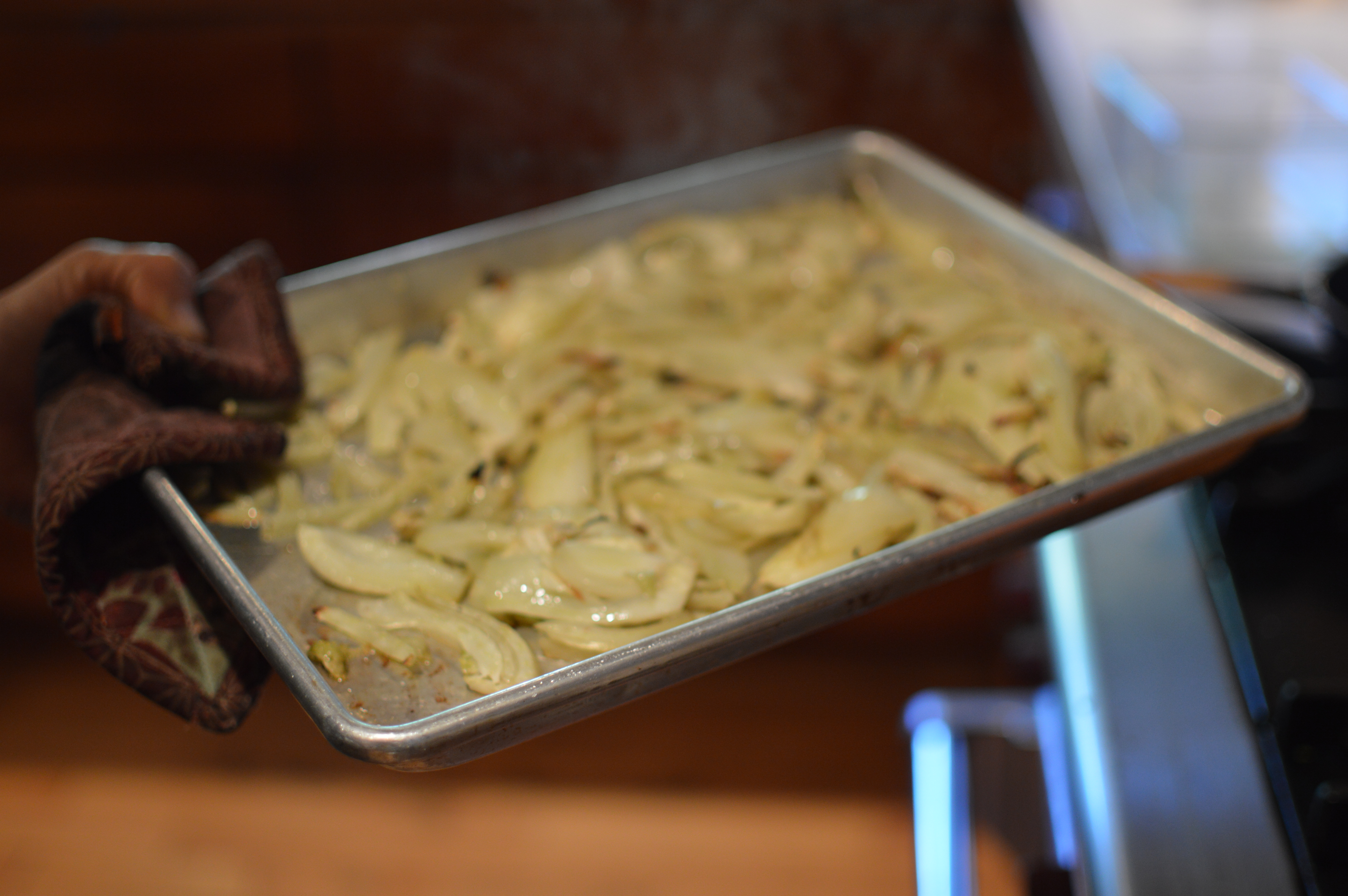 Cut the squash in half. Slice each of the halves into 1/2 inch sections. Skin each section with a knife by turning the section on its side and cutting the outer skin off in small chunks. Cut each skinned section into wedges roughly 1 inch wide. Place cut squash into a large bowl. Cut the fennel top off, then cut the bulb in half. Slice the root out and then slice each half, cut-side down, into 1/4 inch wide strips. Toss fennel and squash with the olive oil, a generous amount of pepper, and about 3/4 tsp salt. Place on a baking tray and roast for 30 minutes, or until easily pricked with a fork.