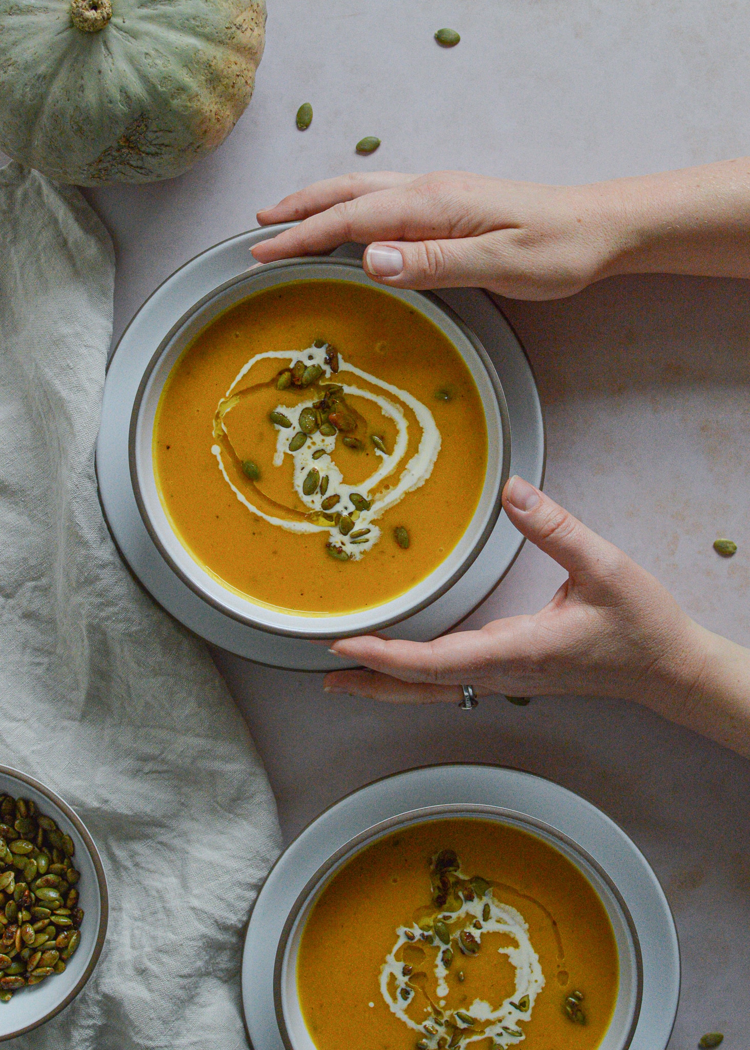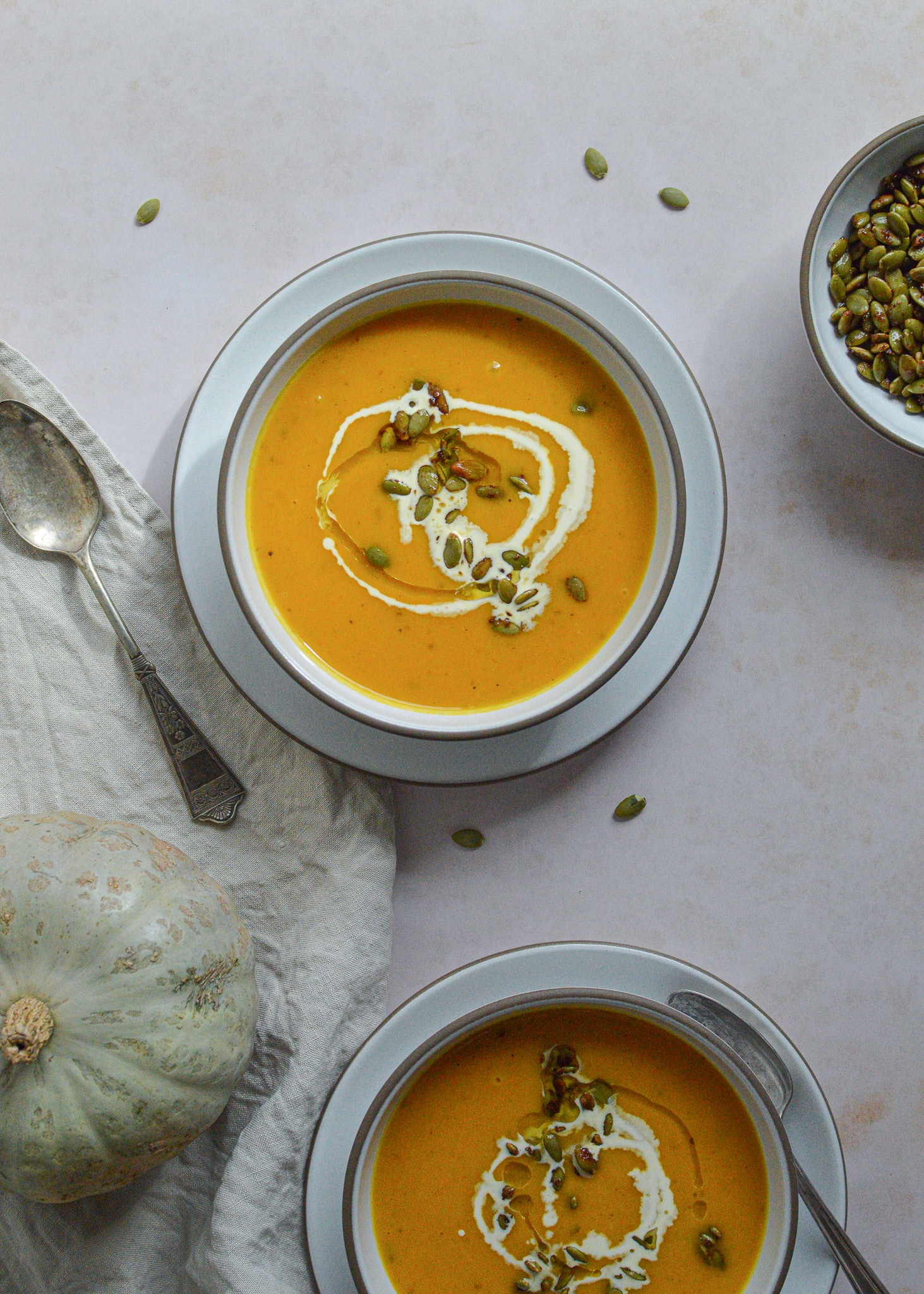Serve the soup hot and garnish with the candied pumpkin seeds.