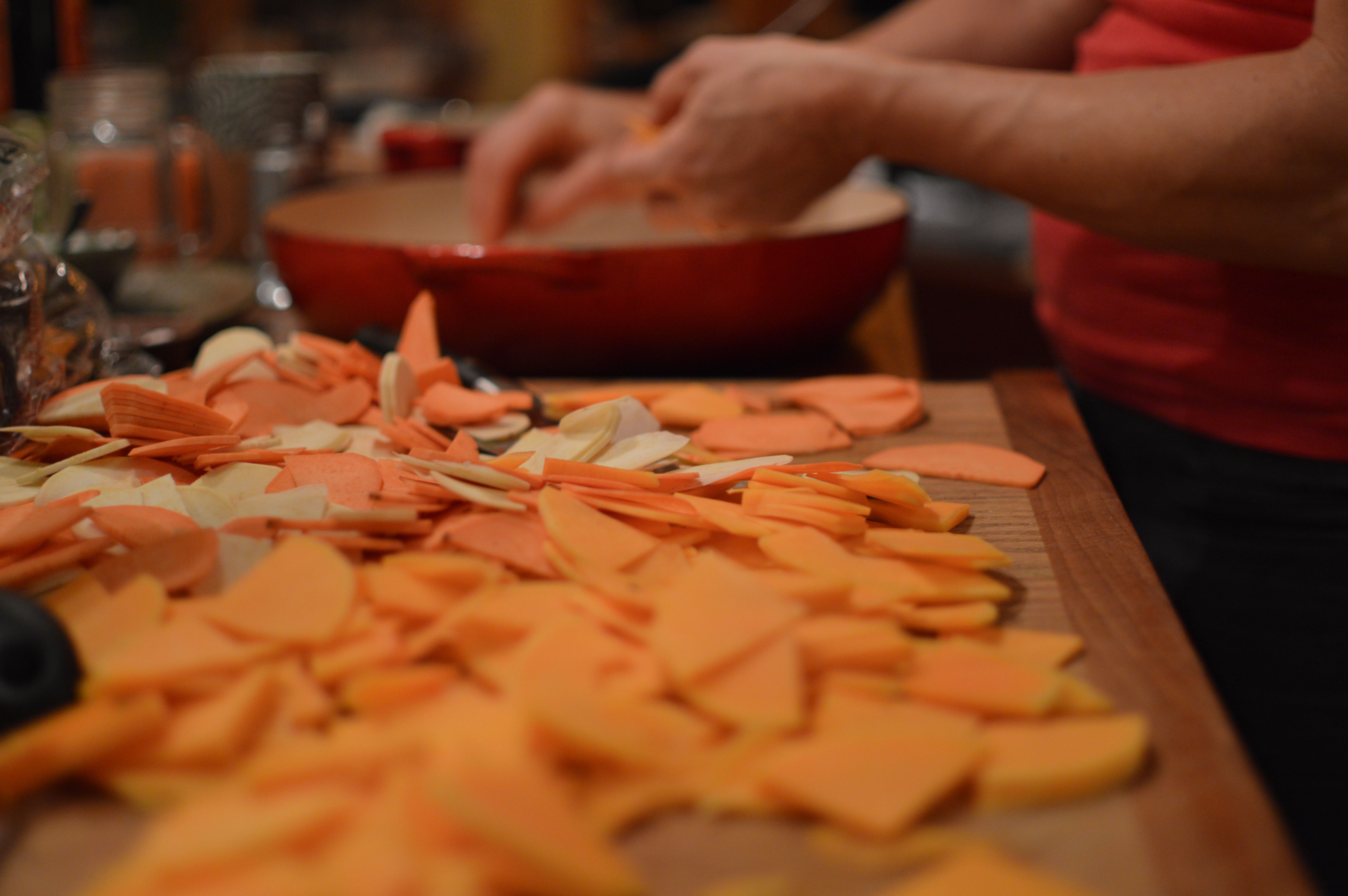 Cut each peeled sweet potato in half lengthwise. Slice horizontally along each half, trying to achieve 1/8 inch slices—the thinner the better. (Alternatively, don’t cut the sweet potatoes in half and use a mandoline or Benriner to make speedy, even slices.) Repeat until all potatoes and the squash are cut likewise. Do not rush this step! It will turn out better the thinner and more uniform the slices are. If you’re confused on how to cut them so thin, just ask my dad: he’s the master.