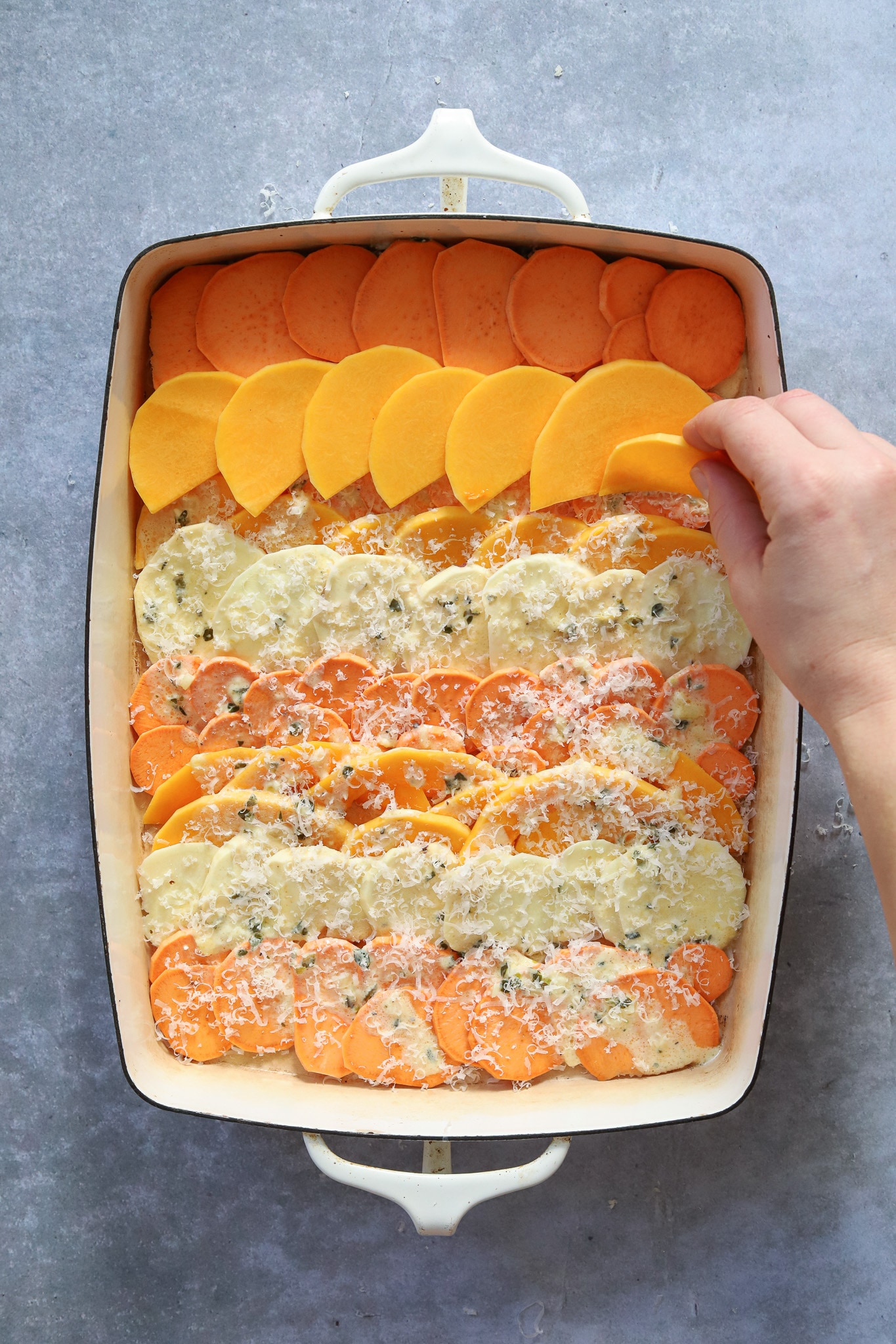 Repeat above steps until you have achieved 3–4 layers, or however many layers it takes for you to use up all the potatoes and squash. Pour any remaining cream sauce over the top and grate more parmesan to cover. Top with the whole sage leaves. Cover the pan tightly with aluminum foil and bake for 30 minutes. Remove the foil and bake for another 30 minutes. Prick with a fork or knife to make sure the potatoes are soft through all the layers.