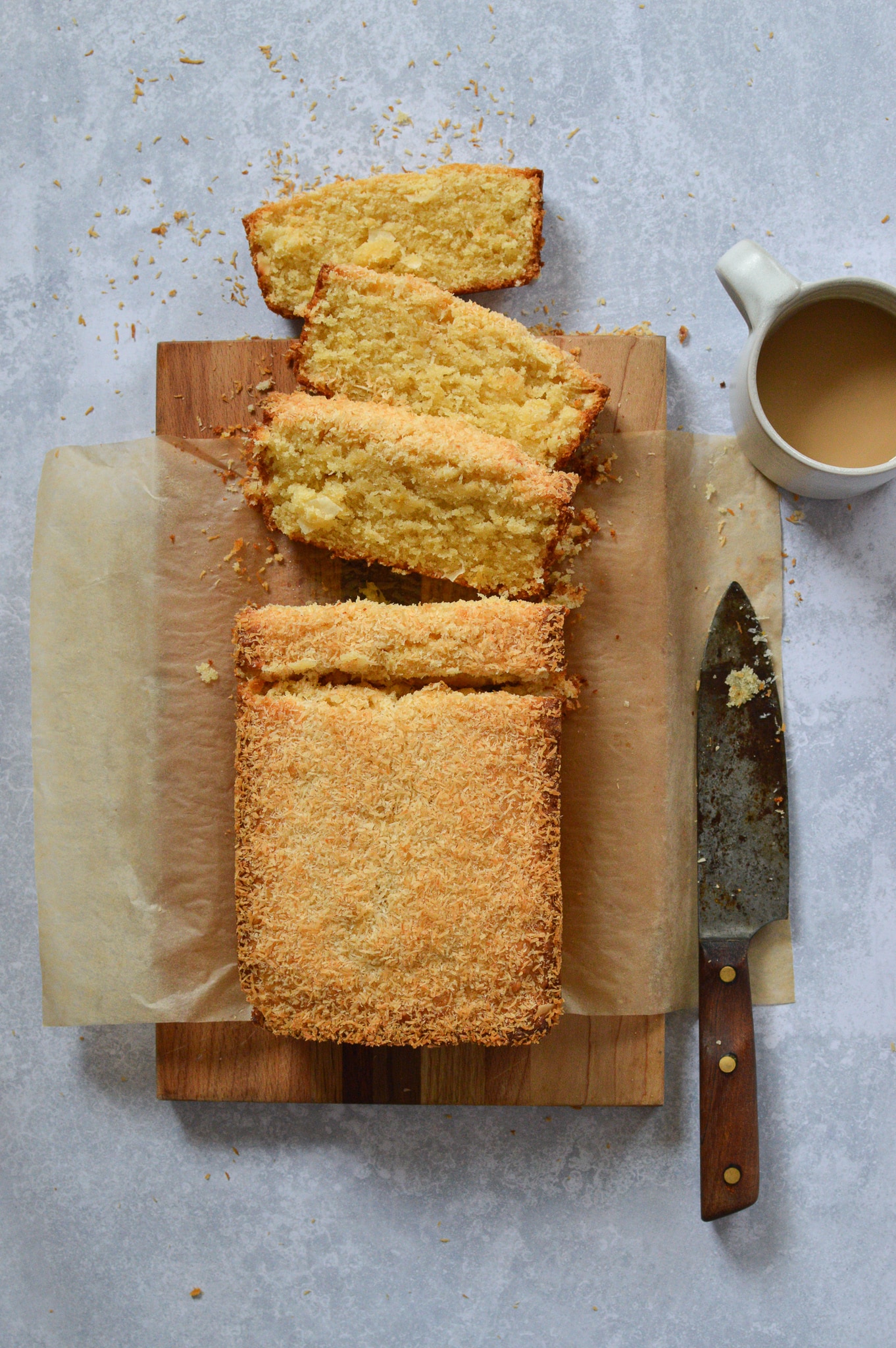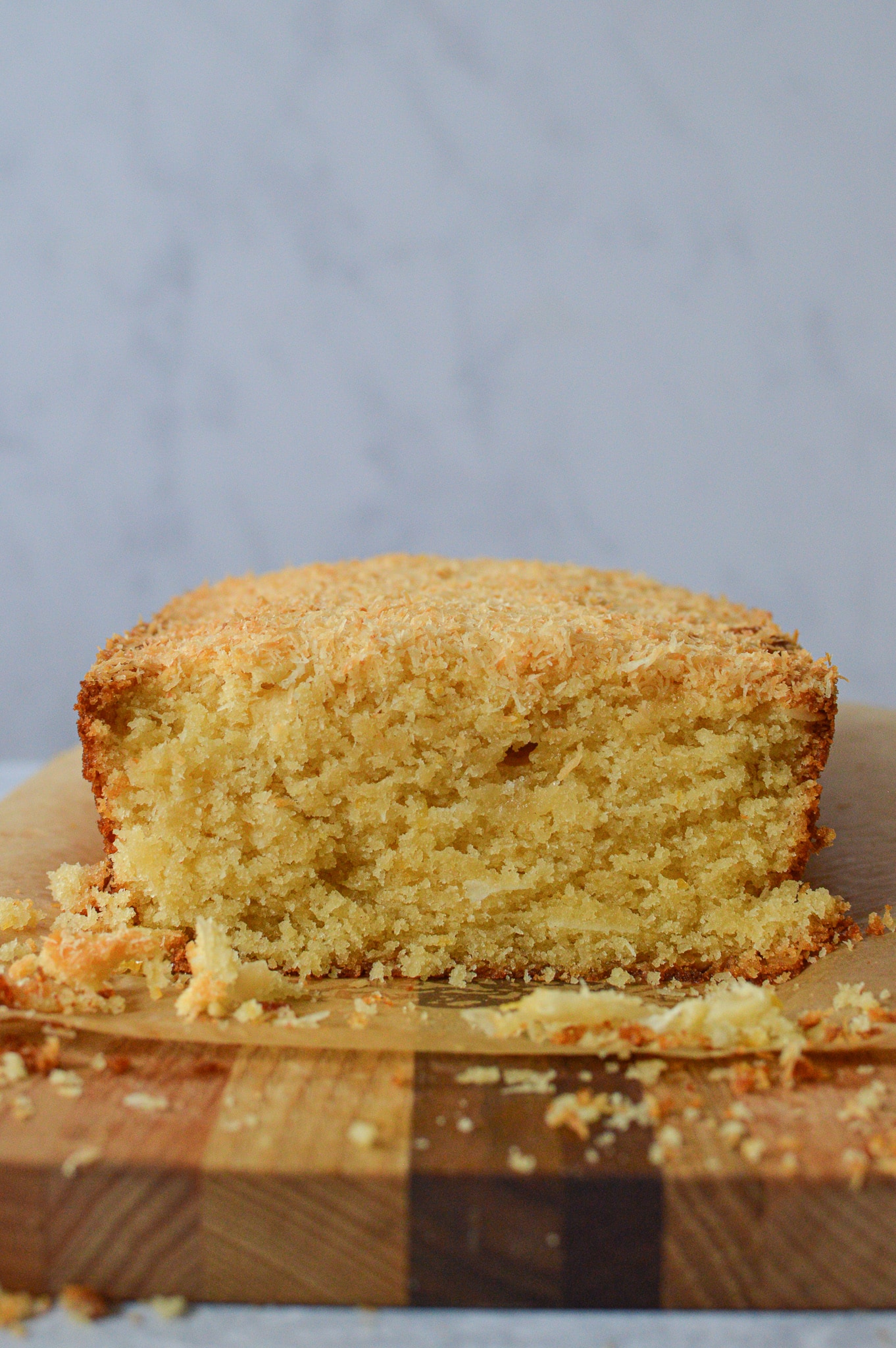Pour the batter into the loaf pan and smooth the top. Bake for 35 minutes, then remove from the oven and sprinkle with shredded coconut. Bake for another 10-15 minutes. The tea cake will be done when a toothpick comes out moist, but free of crumbs. Let sit on a cooling rack for at least 20 minutes before cutting. Enjoy!