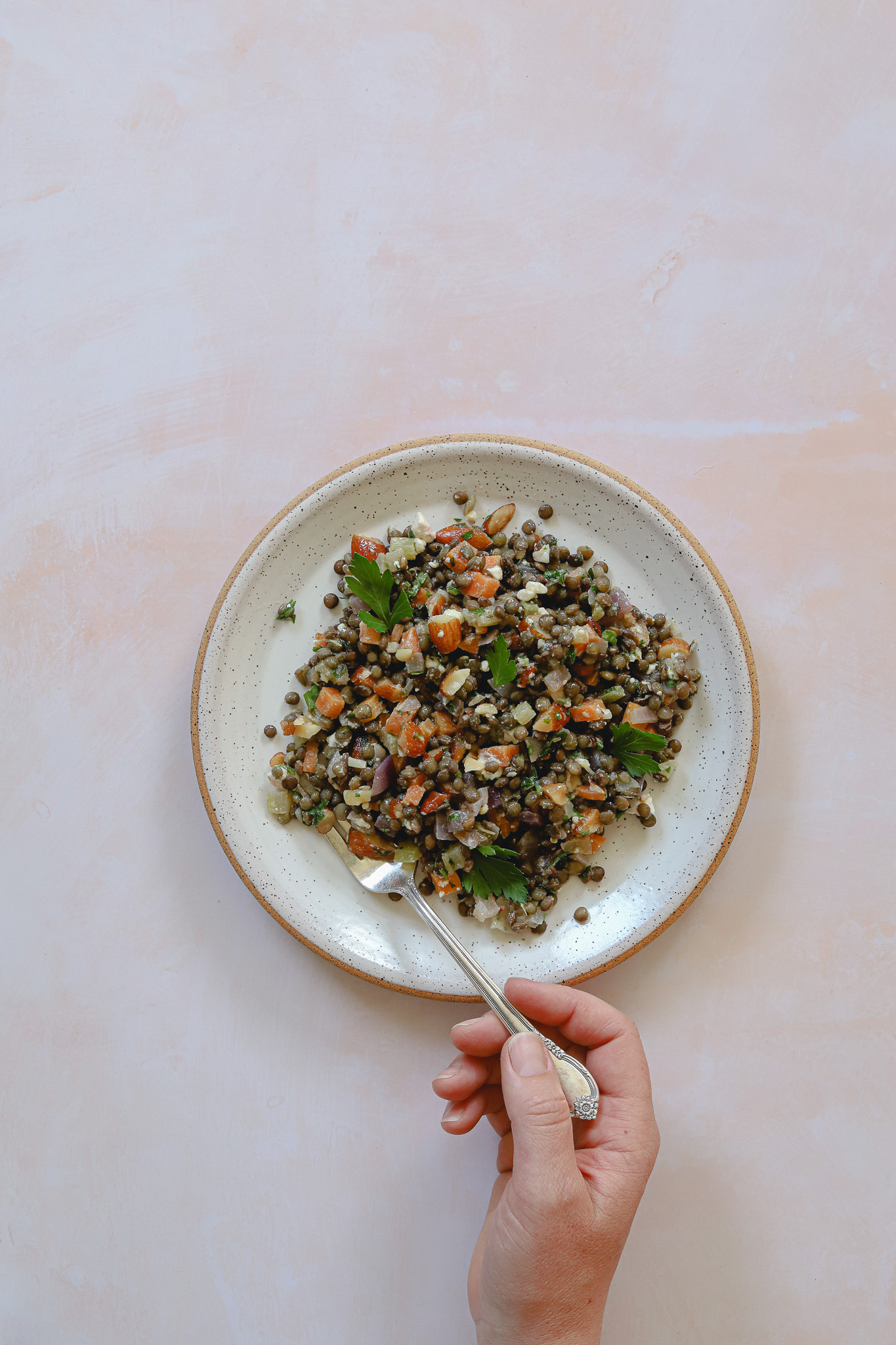 When the lentils are done, drain thoroughly. Add to the bowl containing the dressing, then stir to coat the lentils with the dressing. Let sit, stirring occasionally, while you prepare the final ingredients. Once the lentils have cooled slightly so that they are warm but no longer hot, add the almonds, parsley, feta, and pepper. Stir a few more times to distribute all ingredients evenly.