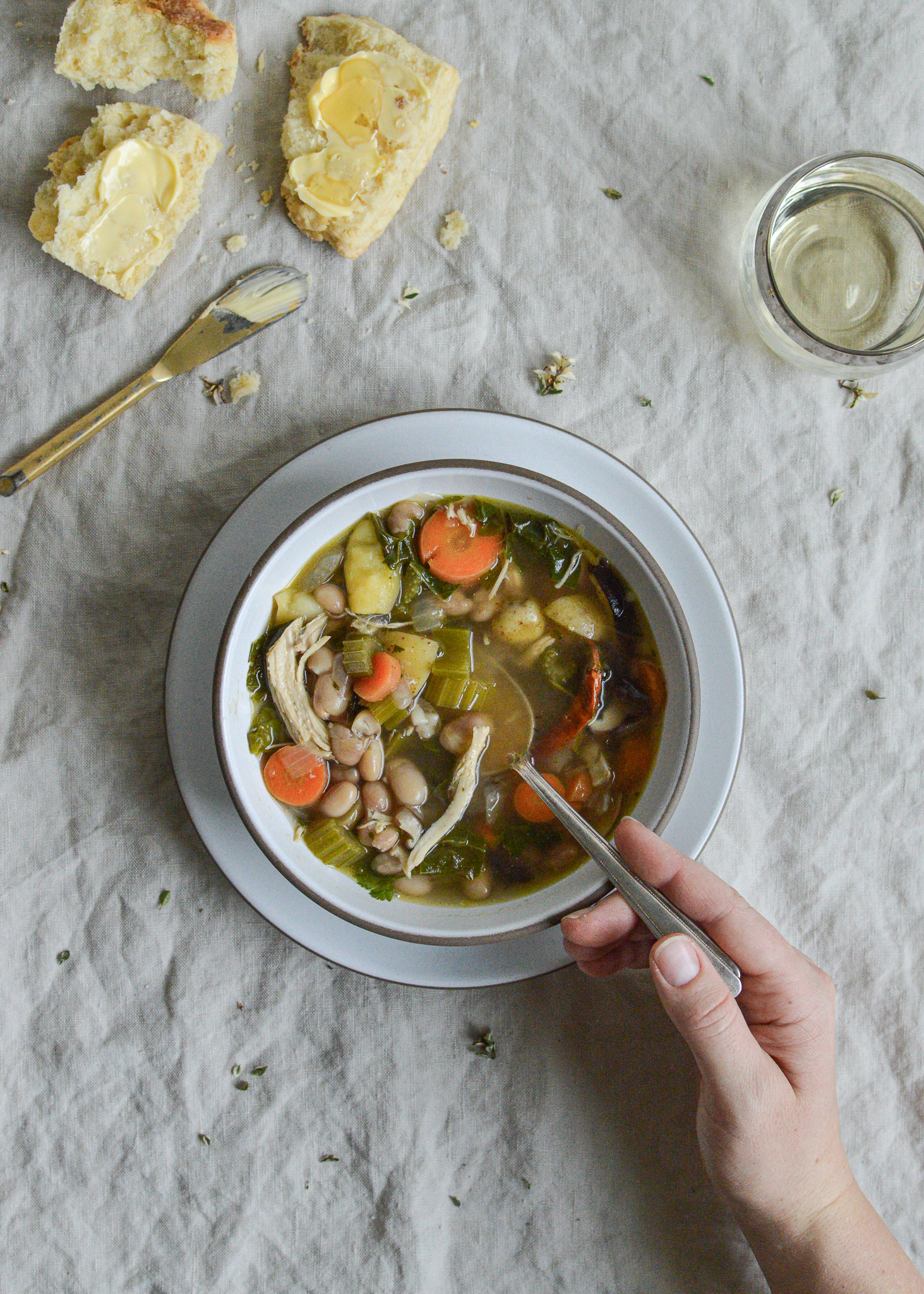 Add all of the chicken broth, then the parsley. Bring the soup to a boil, then turn the heat down and simmer for 20 minutes. Add the cooked beans plus any bean broth, if you’d like, and stir. Taste for seasoning.