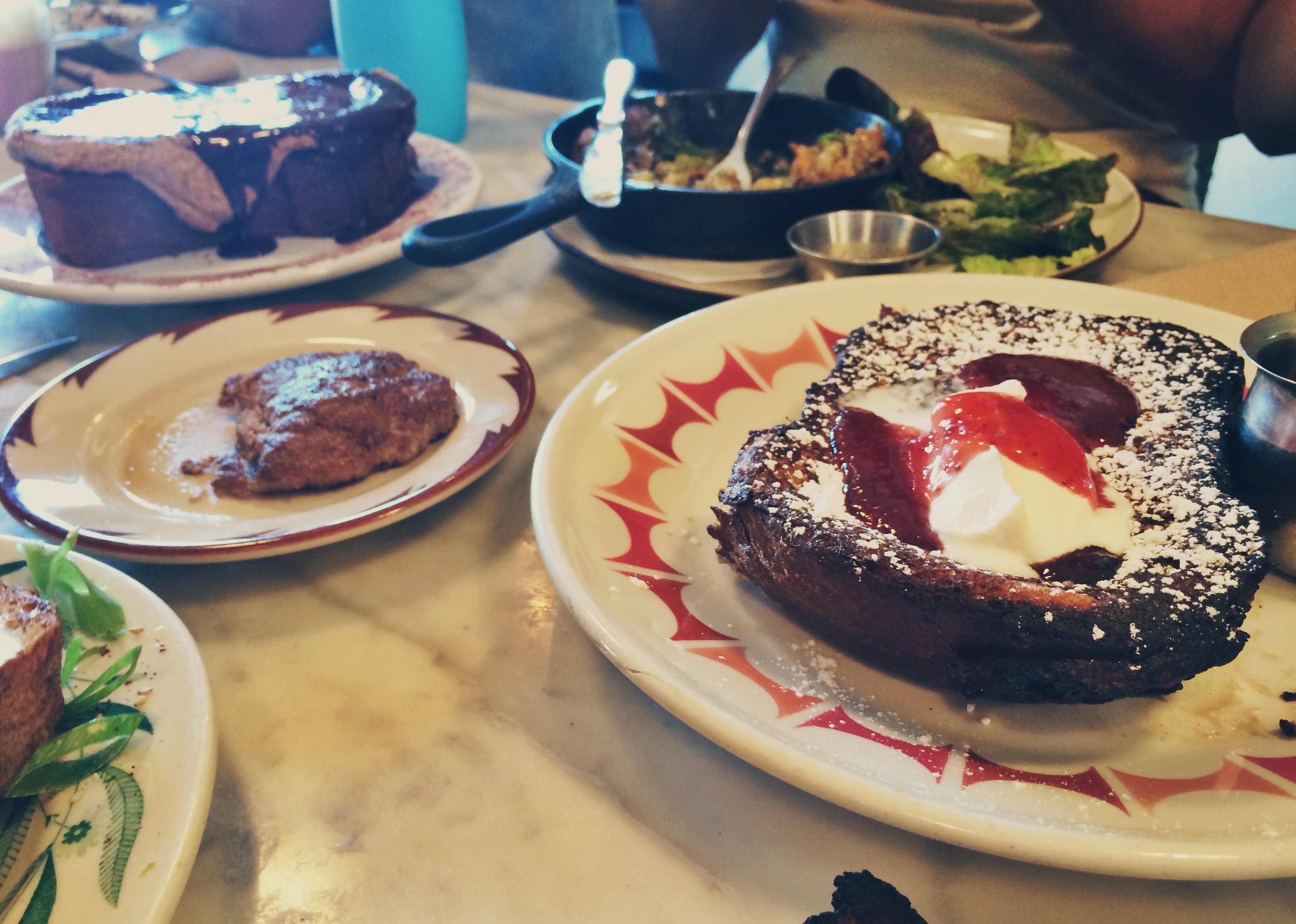 Last week Jonji and I ventured over to Sqirl to celebrate Todd and Jessica’s recent engagement. We had tried to go before with a large group, but gave up after we deemed the wait too long. This time we actually stayed in line, which was SO worth it. For starters, we were standing right next to an adorable puppy, which makes any line more bearable. Once we had finally made it through the line, we got to order. We each got our own dish—I got a delicious open-faced sandwich with arugula, onion jam, and an egg on top—and shared a chocolate and hazelnut-butter toast plus one jam-stuffed french toast, each of which were the size of an iPad but ten times the height. Needless to say, those dessert toasts were absolutely incredible. Well done, Sqirl.