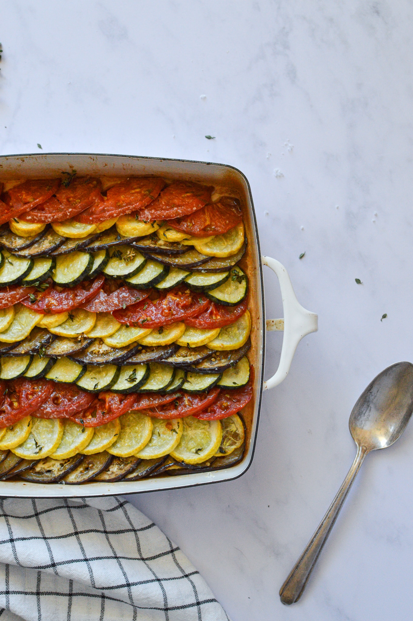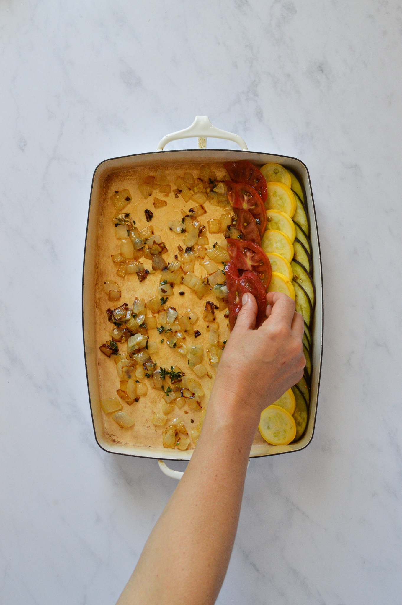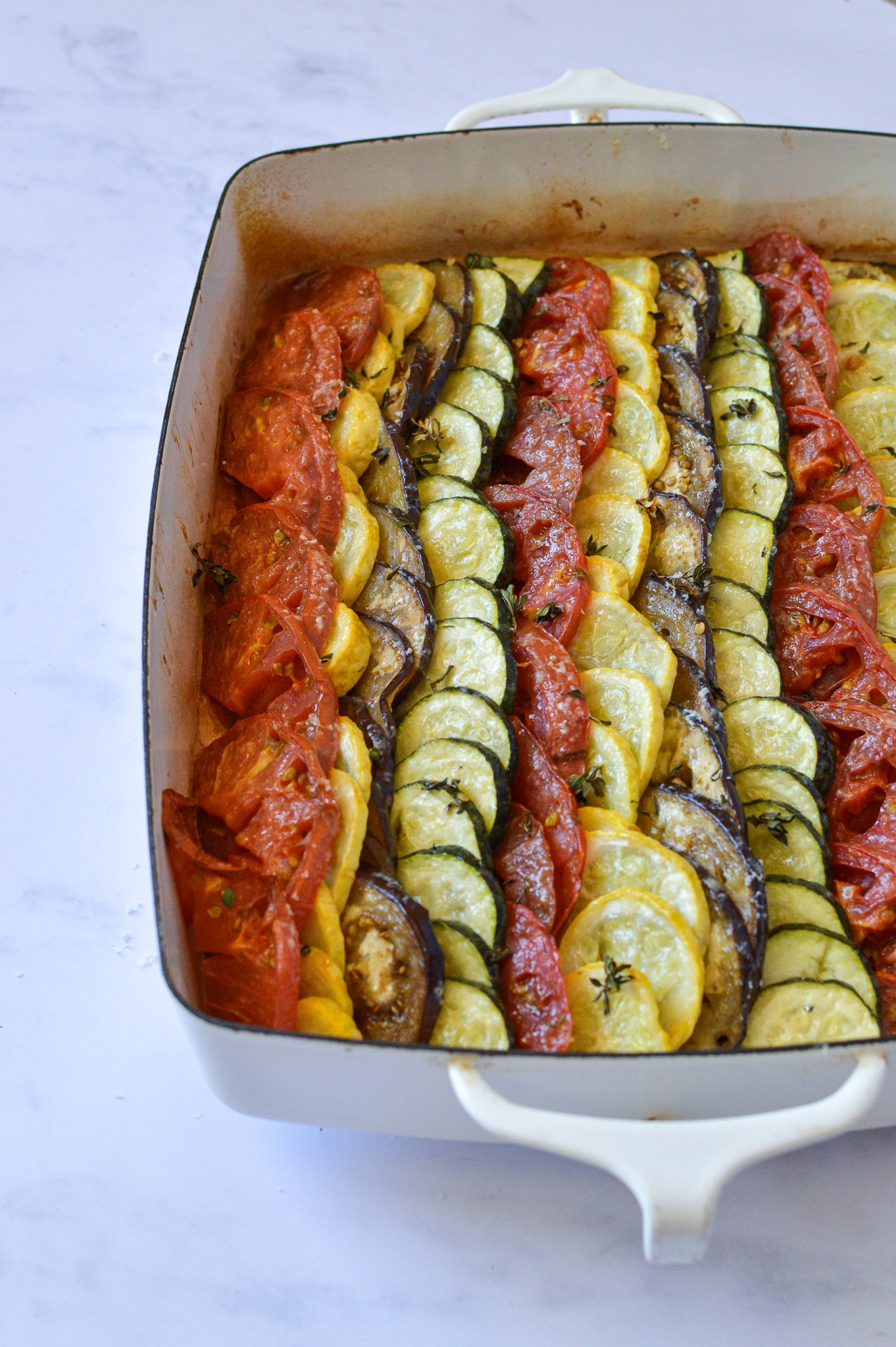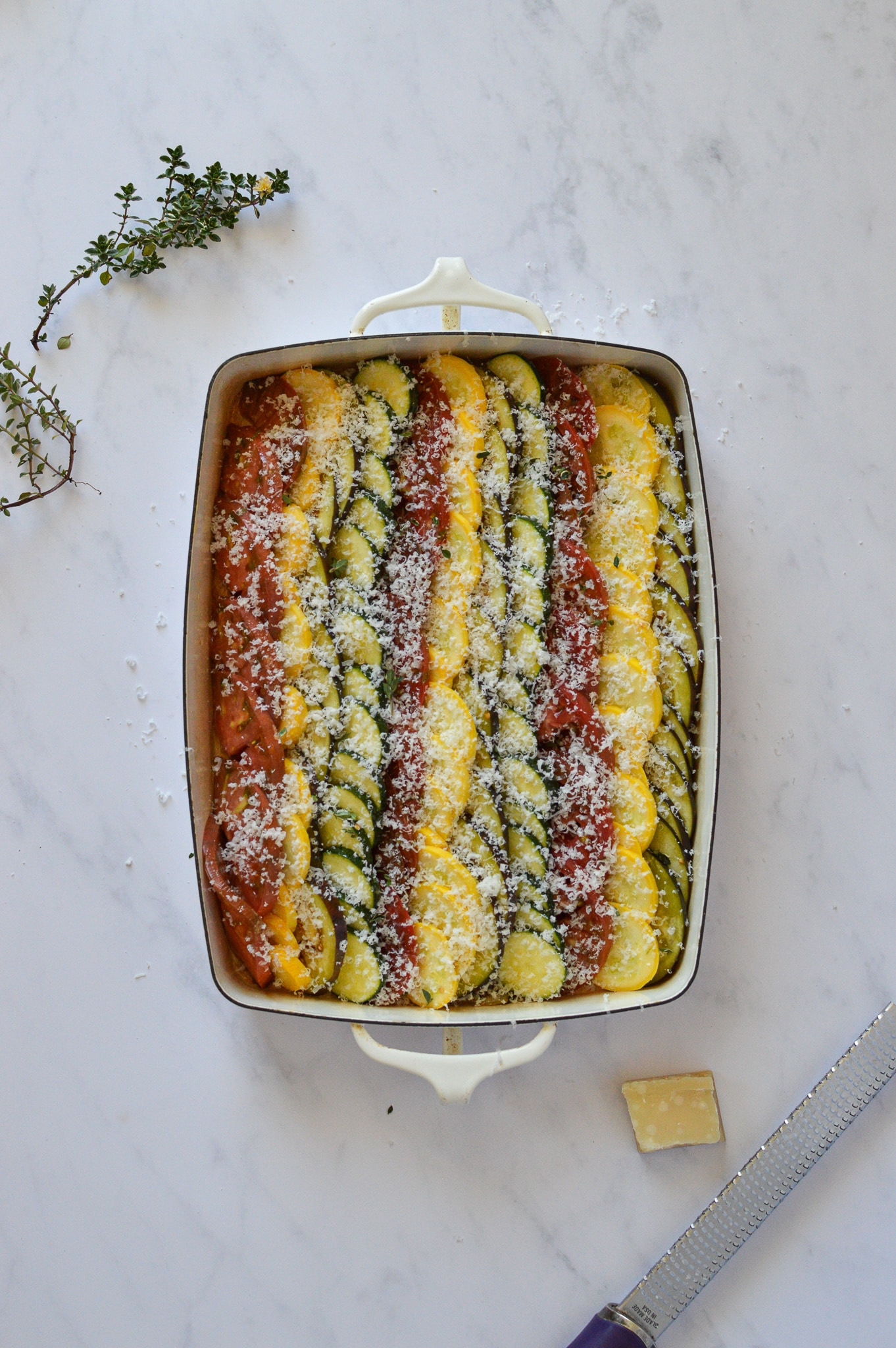 Once the onions are done, spread them on the bottom of a 9 x 12 inch baking dish. Next, make a line of overlapping zucchini along the edge, like fish scales, stretching the length of the dish. Do the same with the squash, the eggplant, and then the tomato. Repeat until the entire dish is full. Sprinkle over the rest of the thyme leaves, and grate a generous amount of parmesan cheese on top.