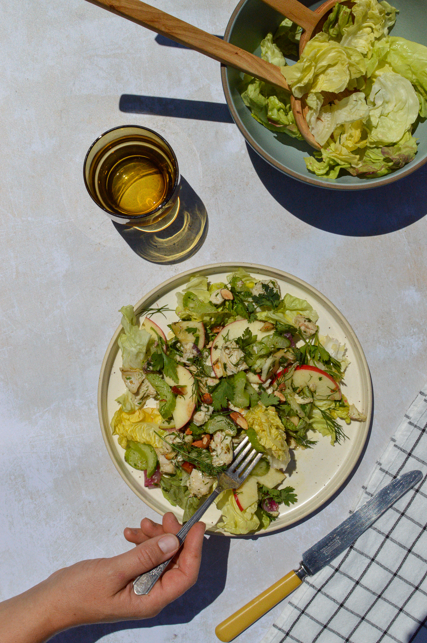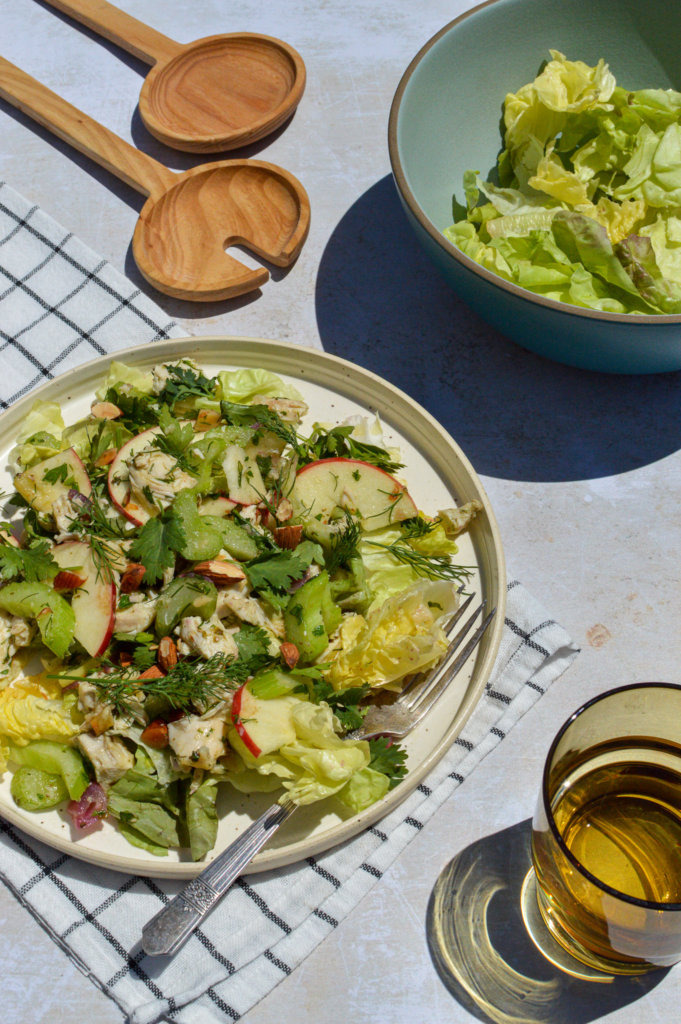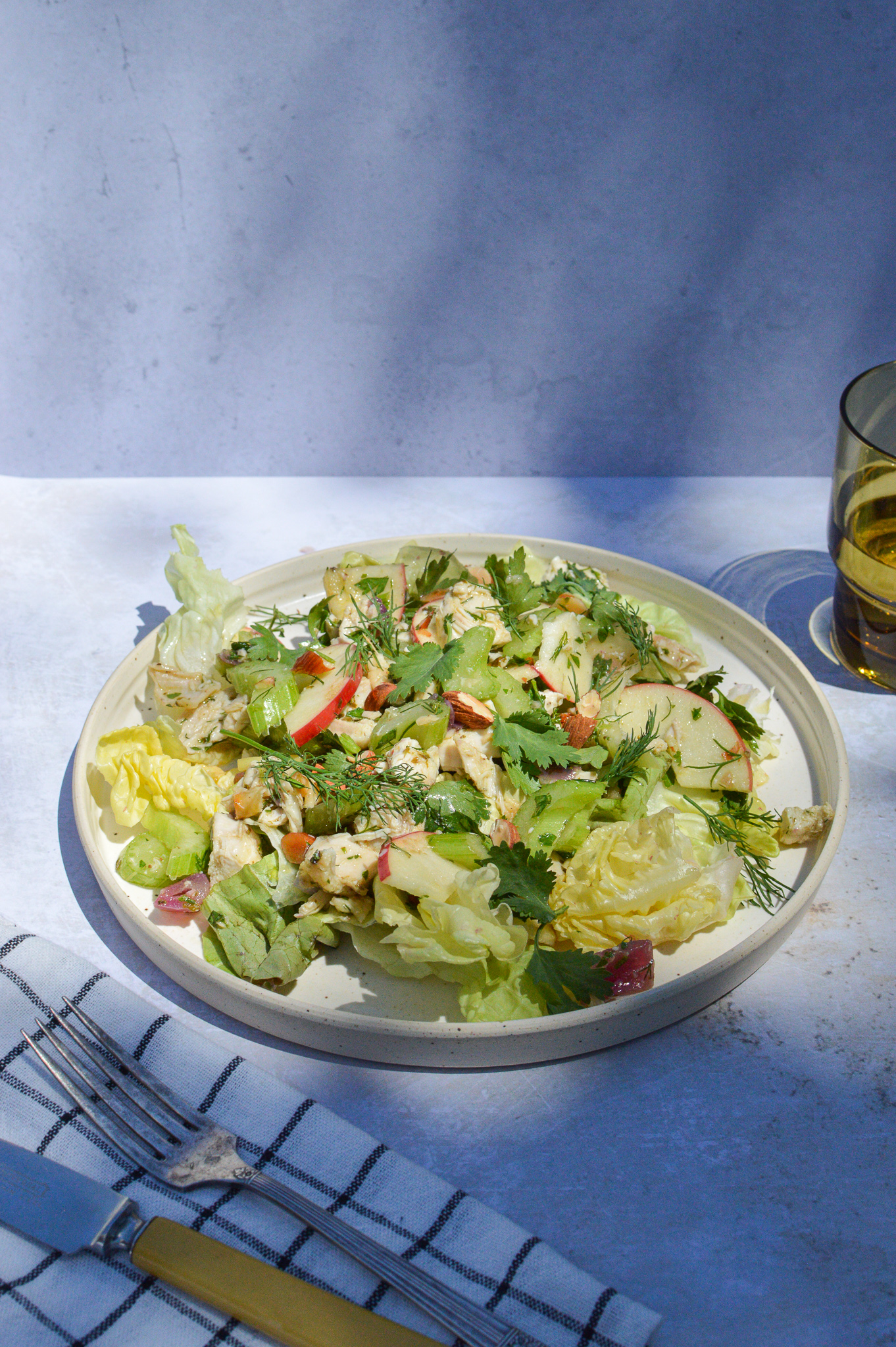 The following recipe is not a hot dish. In fact, it’s quite refreshing. This salad is one of the OG Dawn recipes—it’s definitely one for someone with a long school or work day, or someone with a few kids lobbying for their attention. I distinctly remember eating this salad at home as a kid, and Bailey complaining about the dill (as always). Since then, I’ve tweaked a couple elements, but it still retains the same comforting qualities. Crunchy apple and celery chunks mix with herbs and almonds on top of crisp lettuce to produce a fresh and satisfying dish. It’s simple, refreshing, and easy to prepare elements ahead of time. I like to make the chicken the day before a busy day, so all I have to do is finish chopping ingredients for the salad. Enjoy!