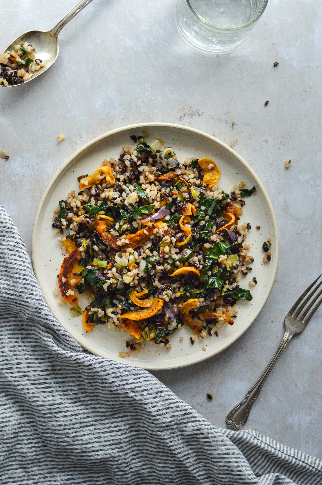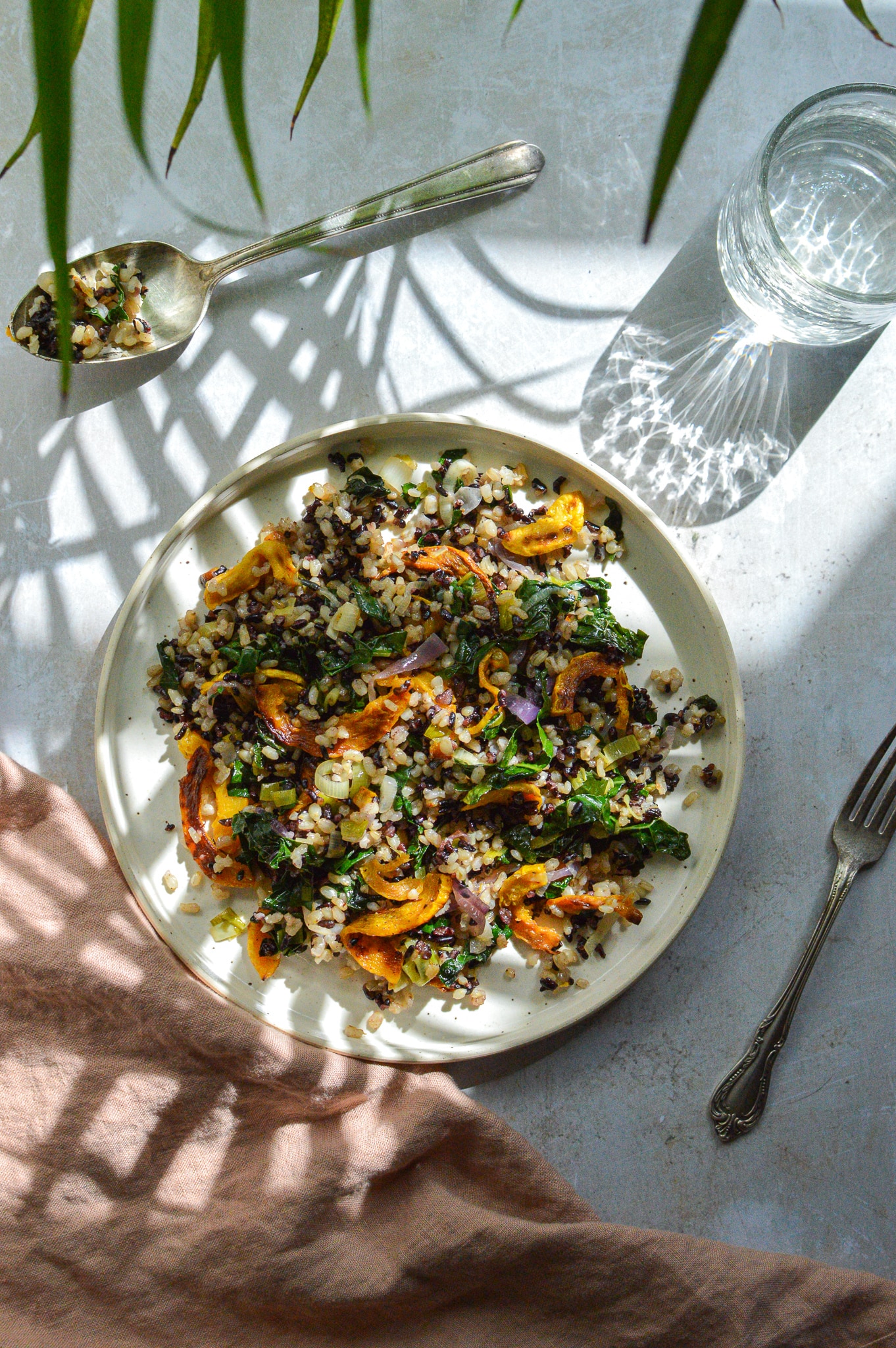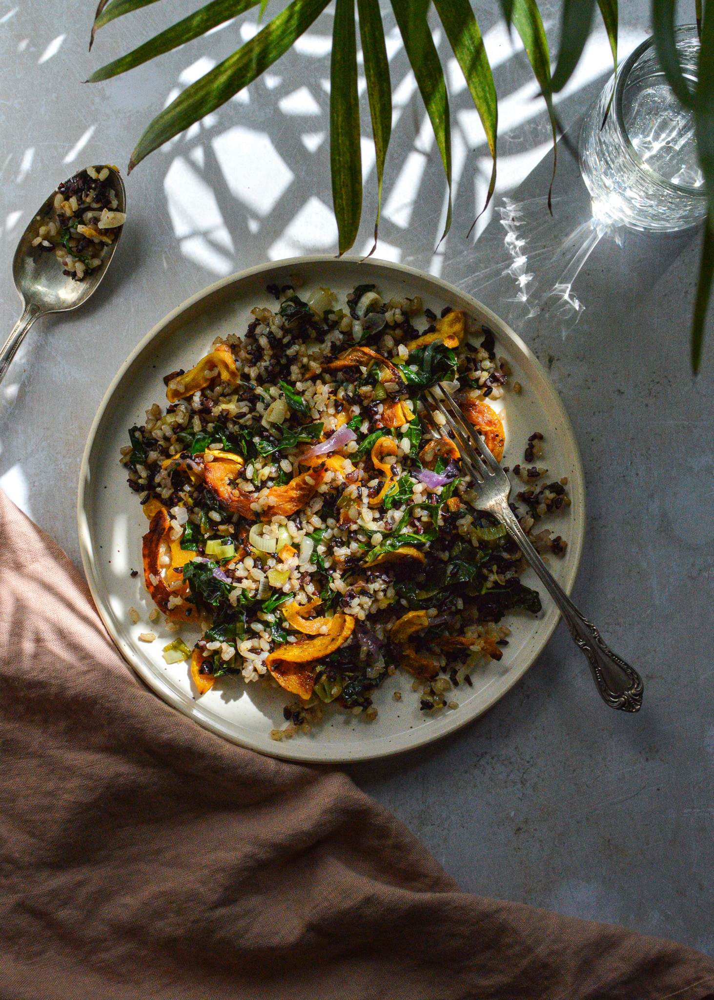 In a large saucepan over medium heat, melt the butter with a couple more glugs of olive oil. When the butter sizzles, add the leeks, onion, and shallot, plus 1/2 tsp salt. Sautée for 7–10 minutes, until the leeks and onion start to caramelize. Add the kale and stir, cooking until the leaves begin to wilt. Add both rices and squash and stir. Taste for seasoning. Serve warm.