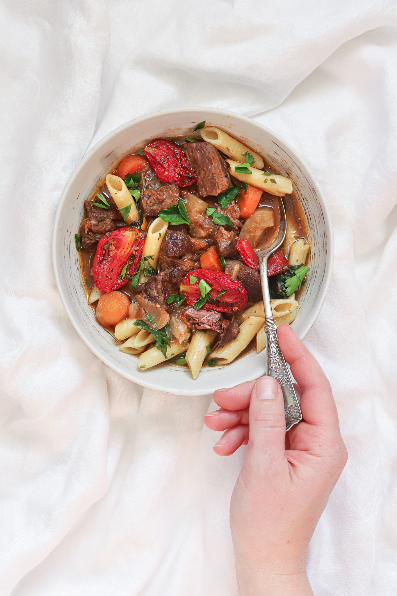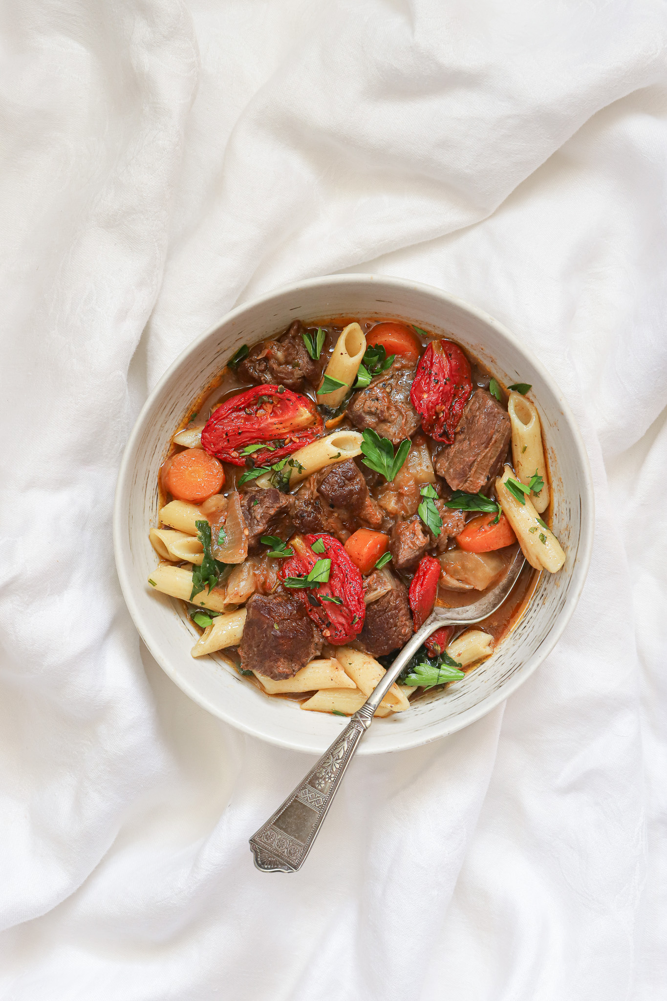 Forty minutes before the meat is done, start boiling water for the pasta. Cook your pasta according to the instructions, then drain and set aside. Once the meat is out of the oven, let it rest for ten minutes. Remove a cup or two of the stew liquid and pour into a large saucepan over medium heat. Add the pasta to the saucepan, along with the 3 tbsp butter. Cook for a couple minutes, then add the parsley and spinach. Cook, stirring often, until the spinach has wilted. Serve the pasta over (or under) the beef stew. Enjoy!