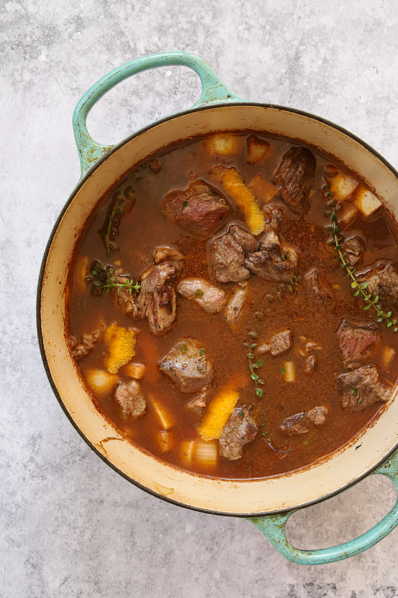 The night before cooking (or, in a pinch, at least a couple hours before cooking), cut the chuck roast into 1- to 2-inch chunks, removing the fat as you go. Place the meat in a large bowl and toss with the garlic cloves, thyme leaves, black pepper, orange zest (peel the zest, don’t grate it), and 2 tsp salt. Cover and refrigerate over night.