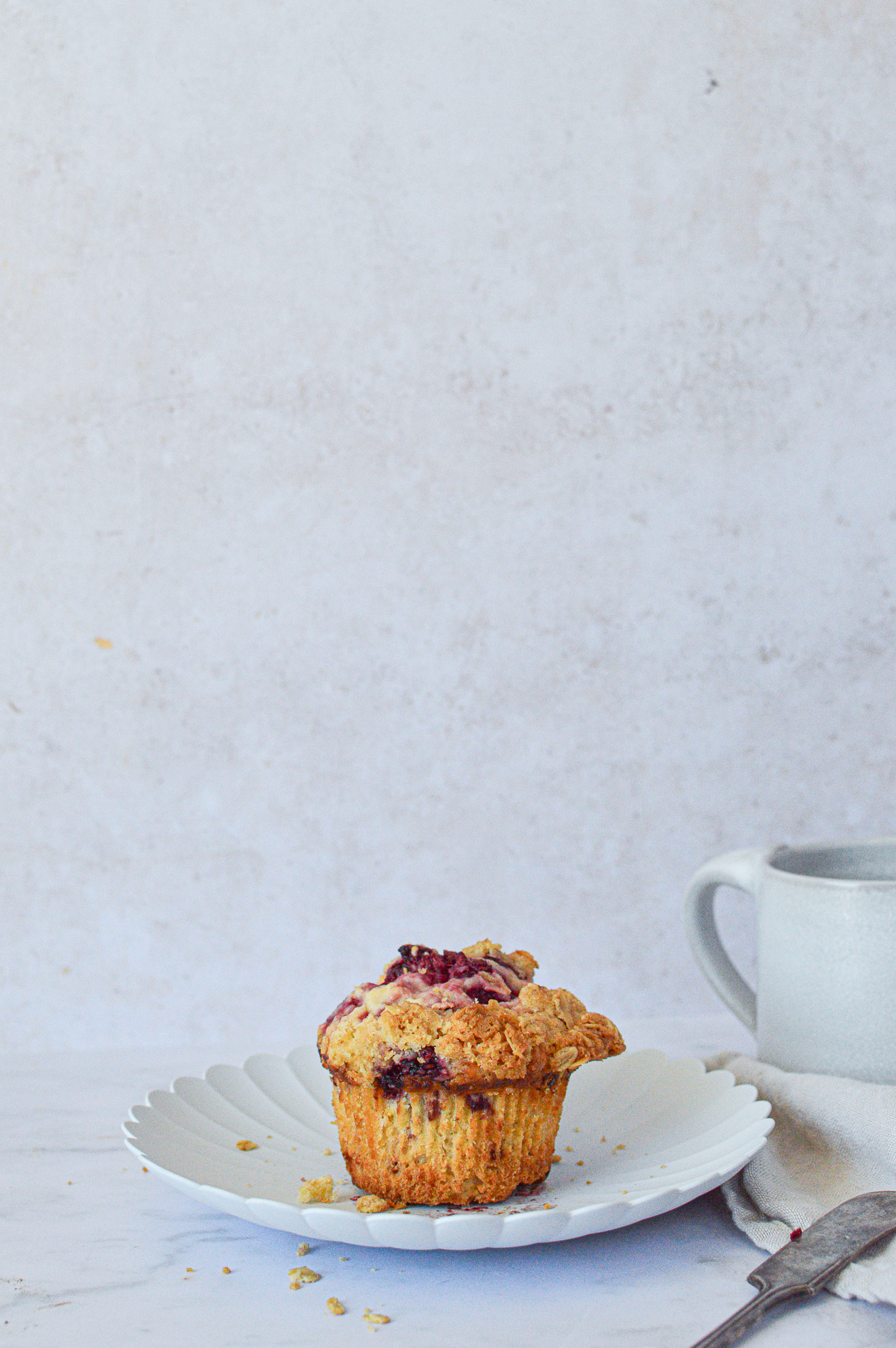 Mix the dry ingredients—280g all-purpose flour, 160g (⅔ cup) granulated sugar, 2 tsp baking powder, ½ tsp baking soda, and ½ tsp Diamond Crystal kosher salt—in a large bowl. In another bowl, whisk together the egg, 120g buttermilk, 120g sour cream, and 85g melted butter. Pour the wet mixture over the dry ingredients and fold in with a rubber spatula, mixing until just combined. Fold in 250g raspberries. Spoon (or use a ¼ cup capacity ice cream scoop) the batter into a greased muffin pan. Top each spoonful with crumble topping, pressing down slightly. Bake for 25 minutes, or until an inserted toothpick comes out clean. Enjoy!