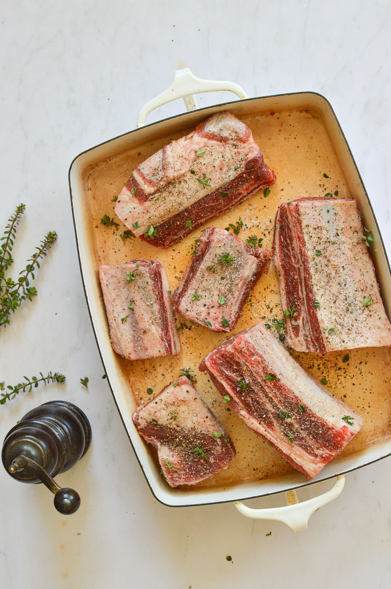 Rub the short ribs with the thyme leaves and 1 tsp freshly cracked black pepper. Cover and refrigerate at least 3 hours or overnight. Remove from the fridge half an hour before cooking and season all over with the 2-3 tsp salt.