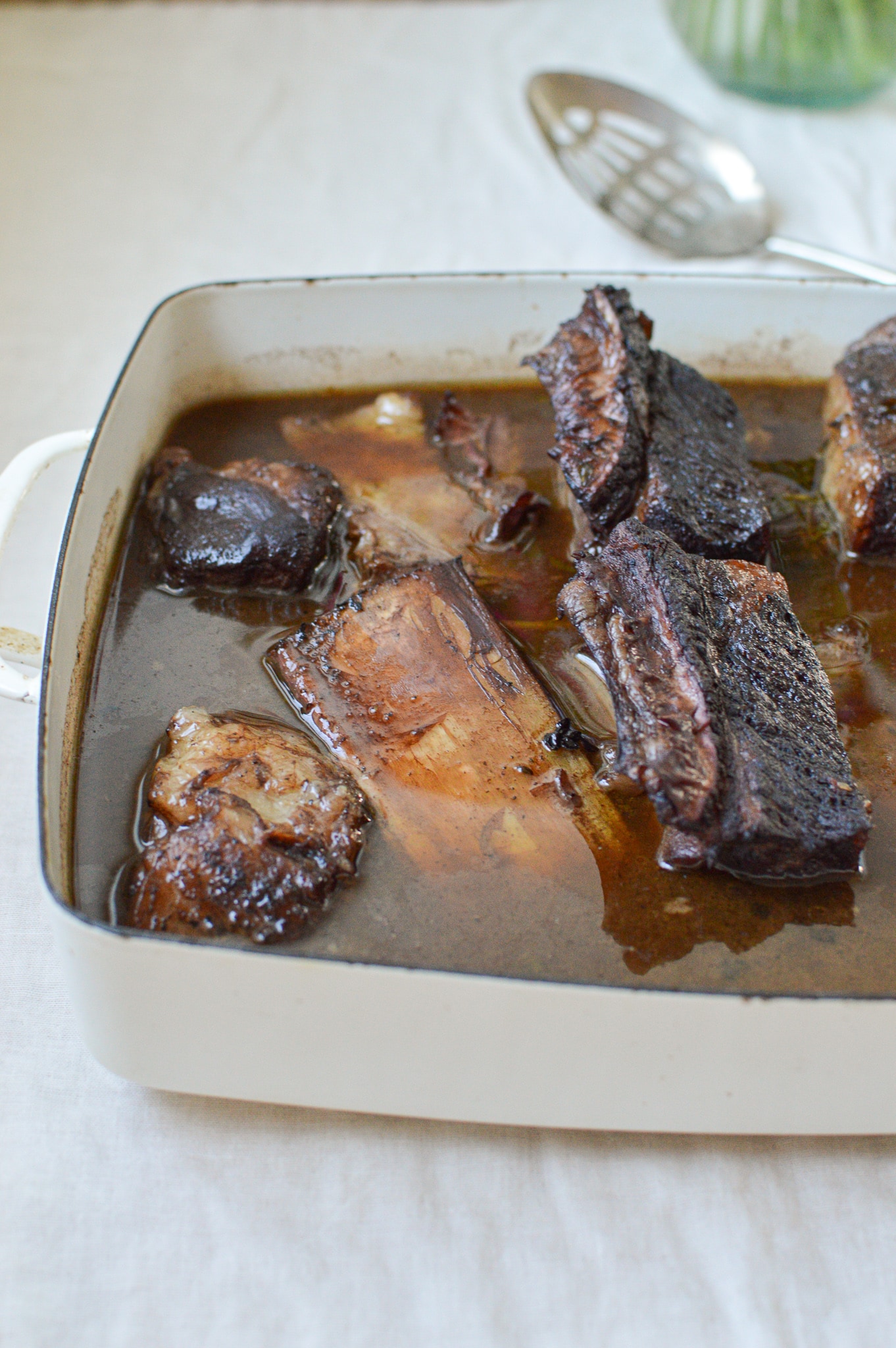 Once the meat is done, let it rest for 15 minutes and turn the oven up to 400°F. Place the ribs on a baking sheet and cook for 15 minutes. Meanwhile, remove as many of the vegetables from the sauce as you can using a slotted spoon. Once the ribs are done, place them back in the sauce. Serve them, hot, over fluffy mashed potatoes and sautéed chard*. Enjoy!