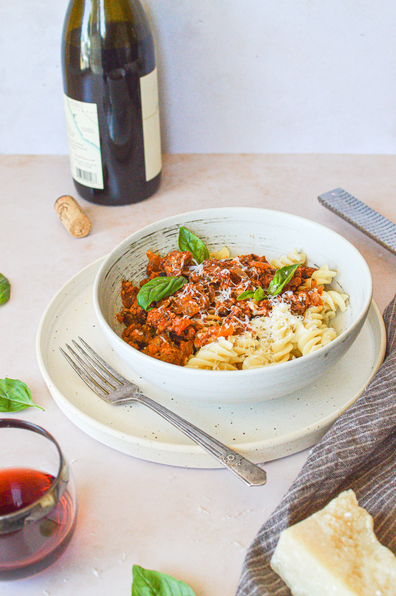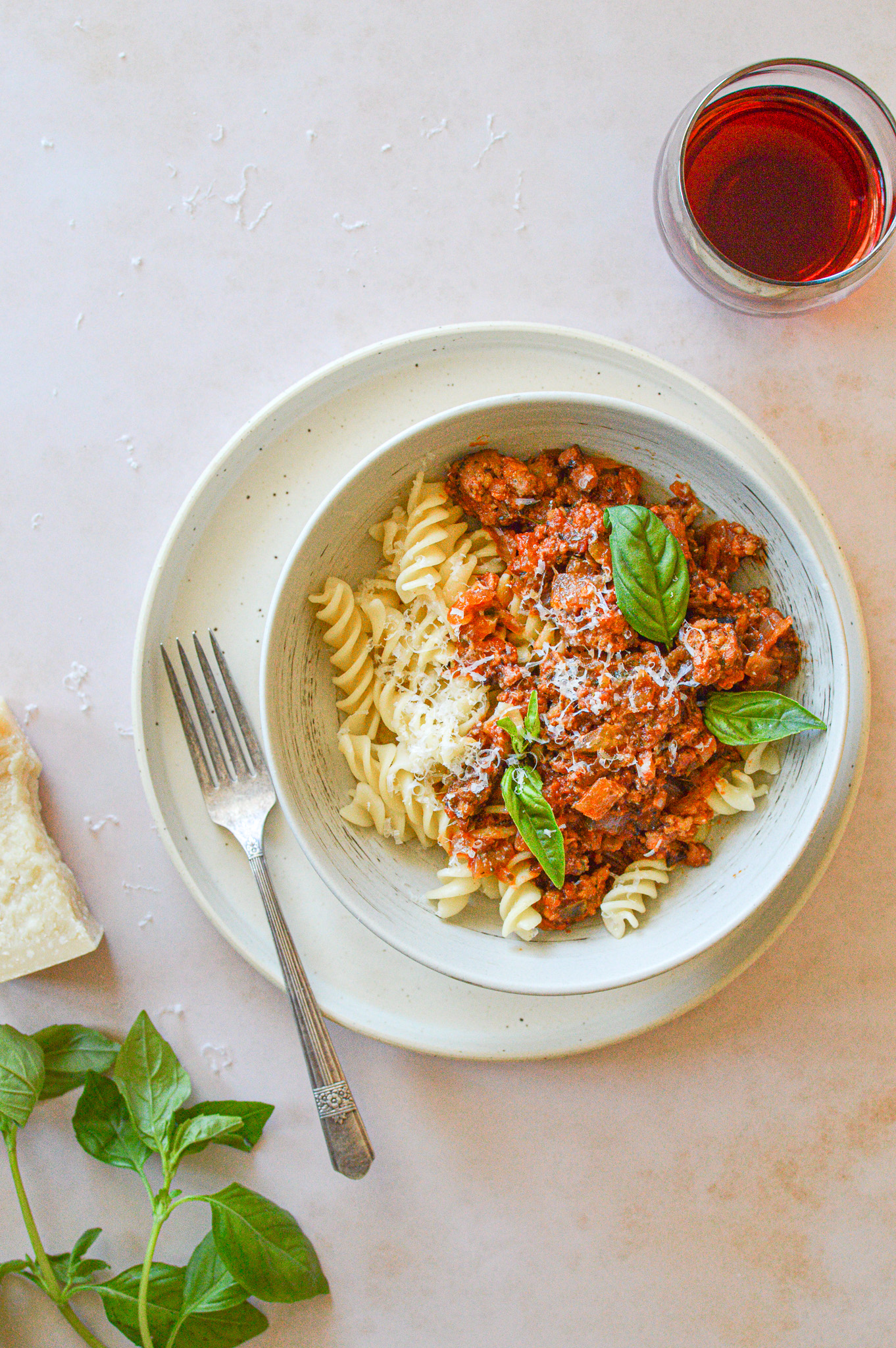 Set a pot over medium heat and add roughly 3 tbsp of olive oil. When it’s hot, add the diced onion, minced garlic, 1/4 tsp salt, some freshly ground pepper, and half the chopped herbs. Cook, stirring often, until the onion has softened, about 5 minutes. Stir in the tomato paste. Once that’s mixed in, pour in the wine and cook for two minutes. Add the tomato puree, along with the rest of the herbs, 1/4 tsp salt, and some pepper, and bring to a boil. Turn the heat down to low and simmer for about 30 minutes. Once you set the heat to simmer, boil water for your pasta and cook according to the instructions on the package.