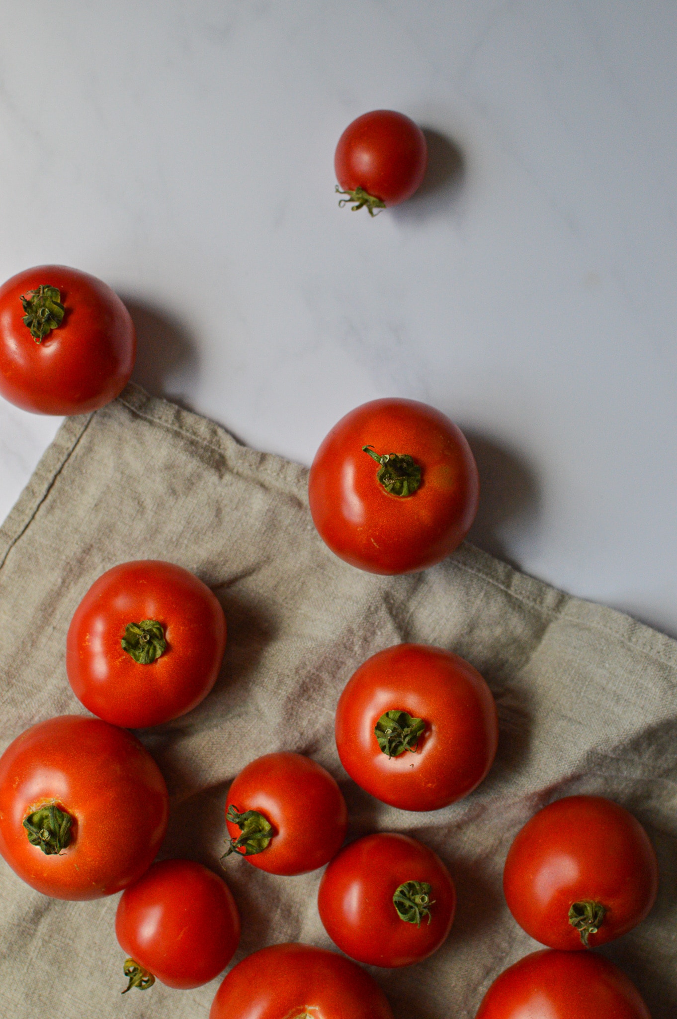 Set a large pot of water to boil. Remove any stems from the tomatoes and make a small, shallow slice in the skin of each one. Once the water comes to a boil, lower the tomatoes into the water and boil for 3 minutes. Drain the tomatoes into a colander and let cool.