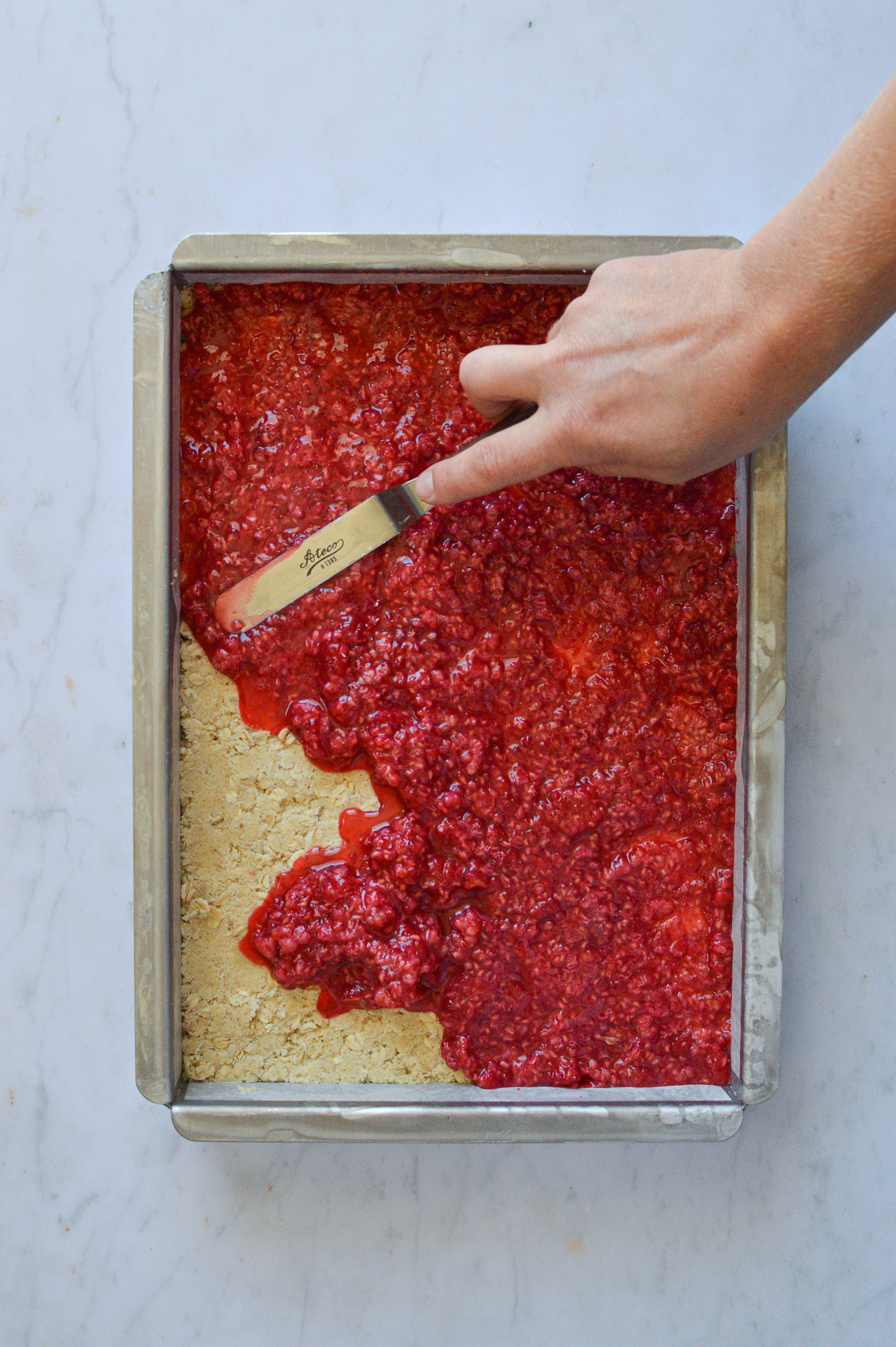 Sprinkle small chunks of the remaining dough over the raspberry “jam” until you’ve used up all the dough.