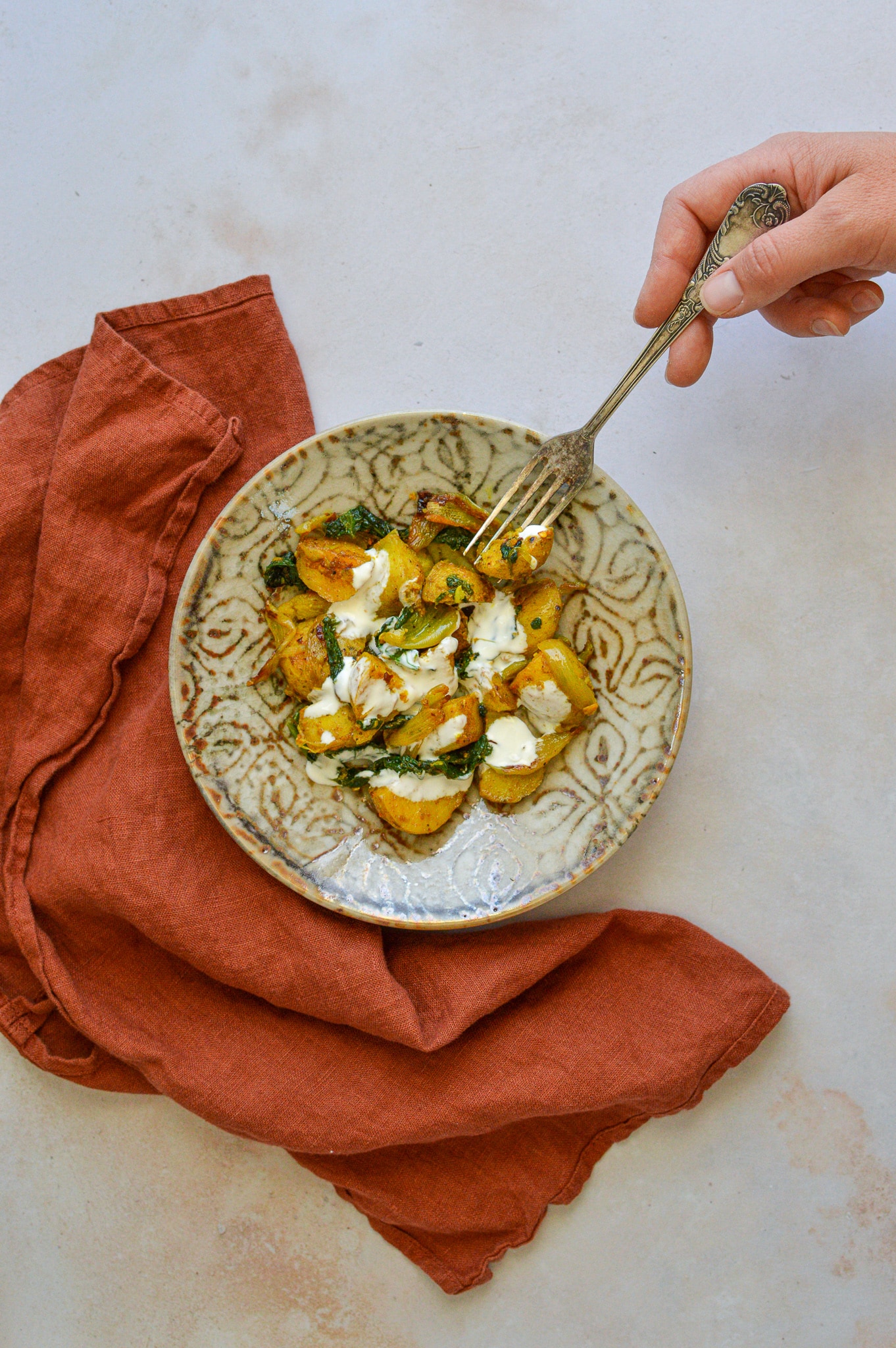 Take the potatoes out of the oven and toss with the spinach and a handful of roughly chopped cilantro. Serve with a drizzle of yogurt on top, plus more on the table. Enjoy!