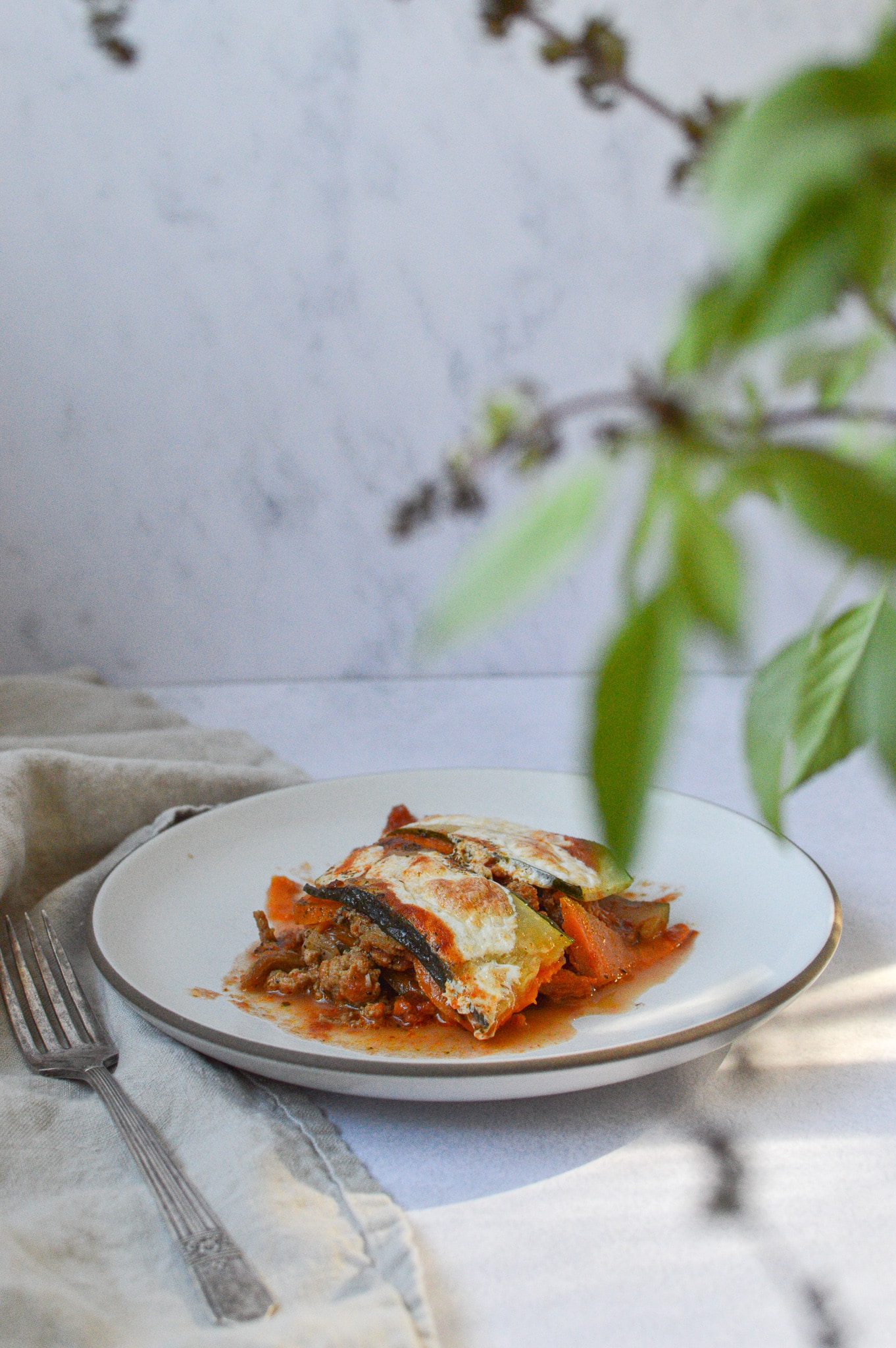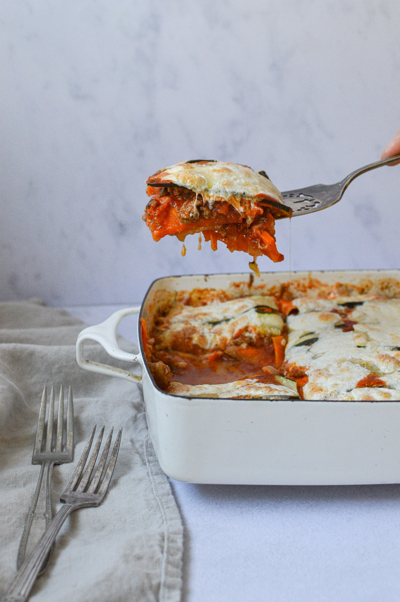 Spread half the meat and tomato mixture in the bottom of a 9×13-inch pan. Sprinkle half the grated carrots over that. Lay sweet potato slices on top in a single layer, then do the same with the zucchini. Top with half of the mozzarella, torn into small chunks, and a decent amount of grated parmesan. Repeat with all the ingredients; you’ll end up with two full layers.