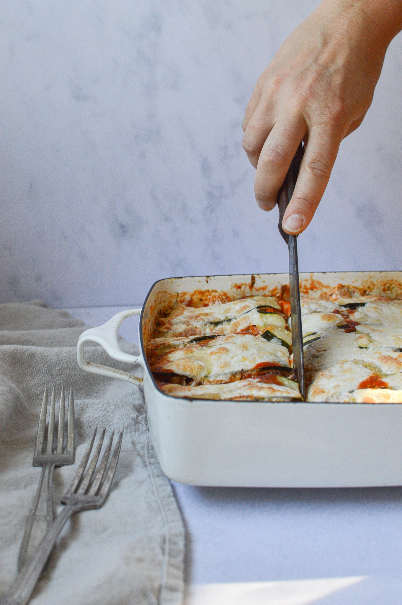 Heat a medium saucepan over medium heat. Add a few glugs of olive oil, then the 1/2 diced onion. Stir occasionally and cook until slightly softened and translucent, about 5 minutes. Stir in the 2 minced garlic cloves and cook for another minute or two. The onion should be pretty soft at this point. Pour in 1/4 cup red wine and cook for a minute, then add the crushed tomatoes, 3/4 tsp salt, several cracks of black pepper, and chopped herbs. Add a little water or broth if the sauce looks a bit thick. Bring to a boil, then turn the heat to low and simmer for 15 minutes, stirring occasionally and adding water or broth 1 tbsp at a time as needed. (Keep in mind the zucchini will release a decent amount of water while the lasagna cooks, so the sauce should be thicker than a normal tomato sauce.)
