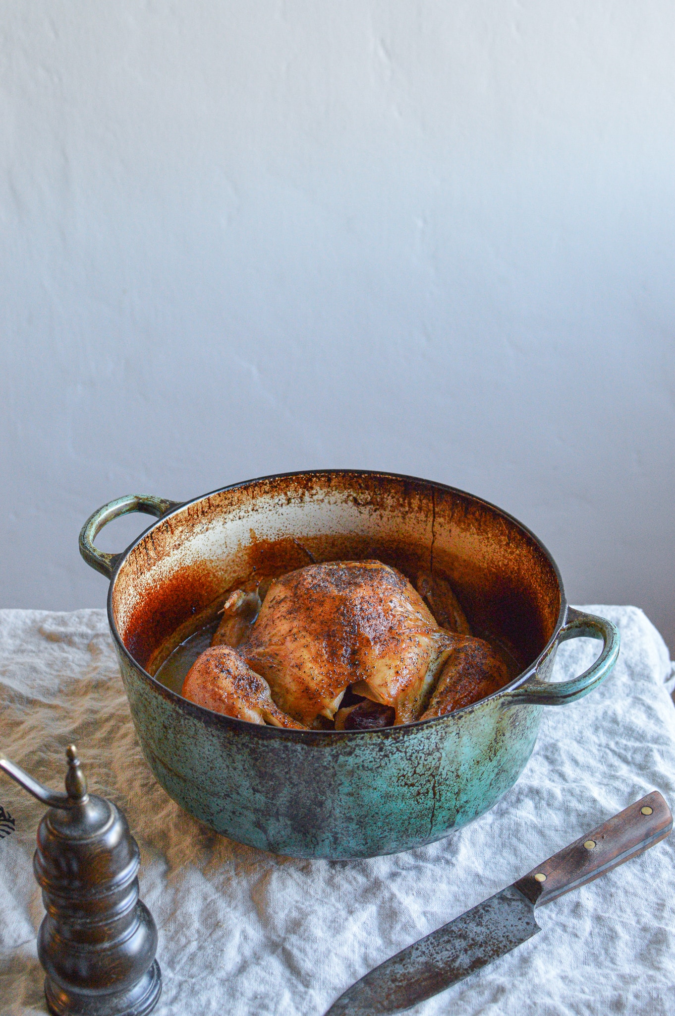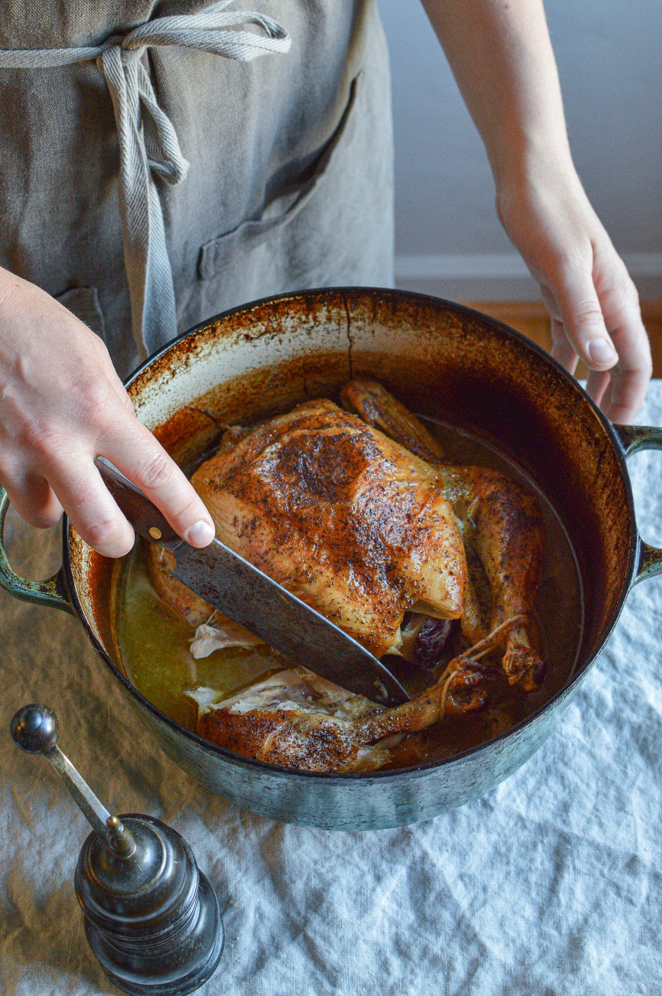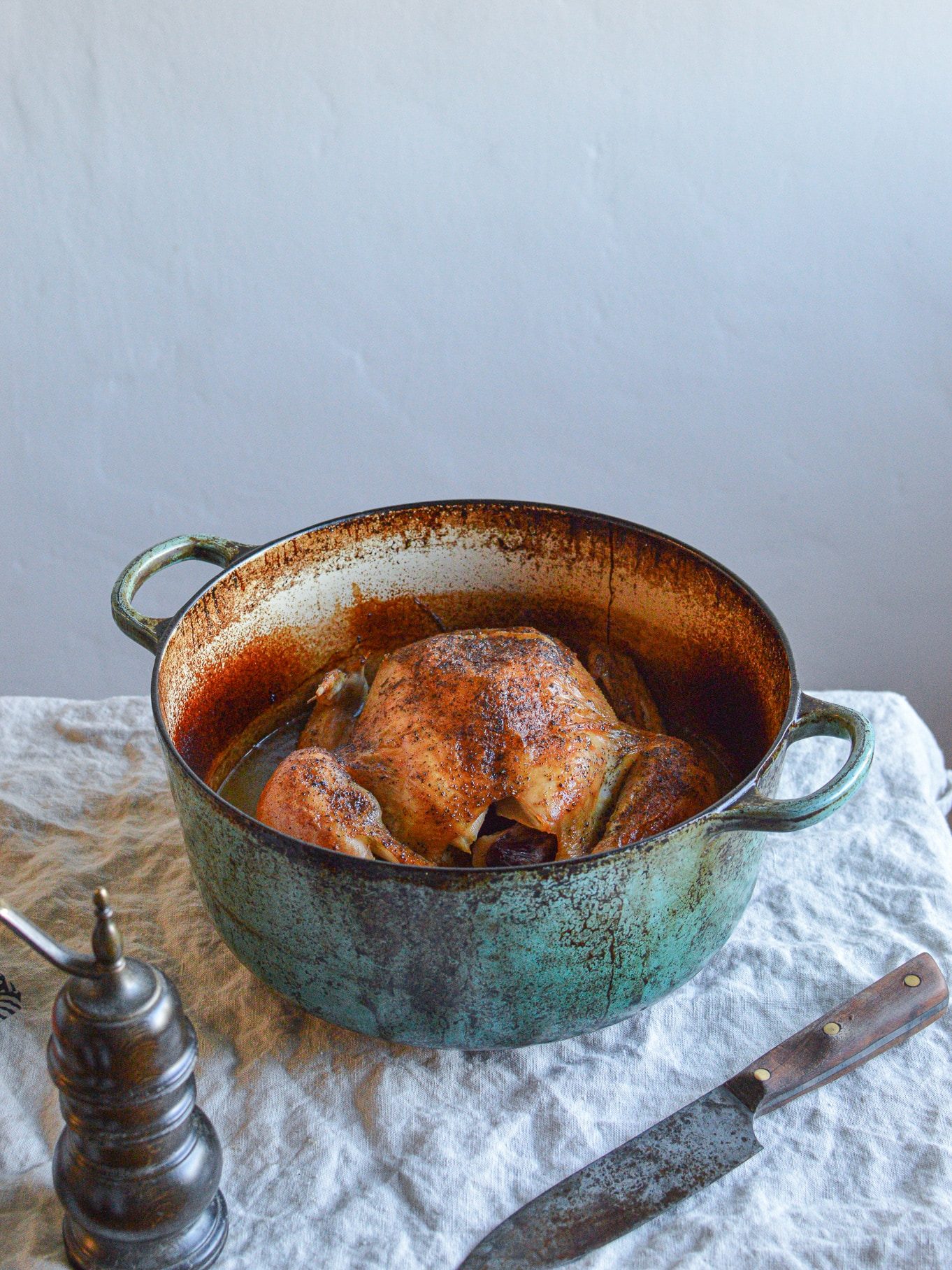 Sprinkle a generous amount of olive oil onto the chicken and rub to coat well. Grind a bunch of pepper on the chicken, then sprinkle all of the salt on top and around the chicken. Pour the white wine into the bottom of the pot. Cover with a lid, or foil if need be, and roast in the oven for 3 hours. Remove the lid, turn the oven up to 375°F, and roast for another 40 minutes, until the skin is crispy and browned. Especially good over mashed potatoes alongside roasted root vegetables. Enjoy!