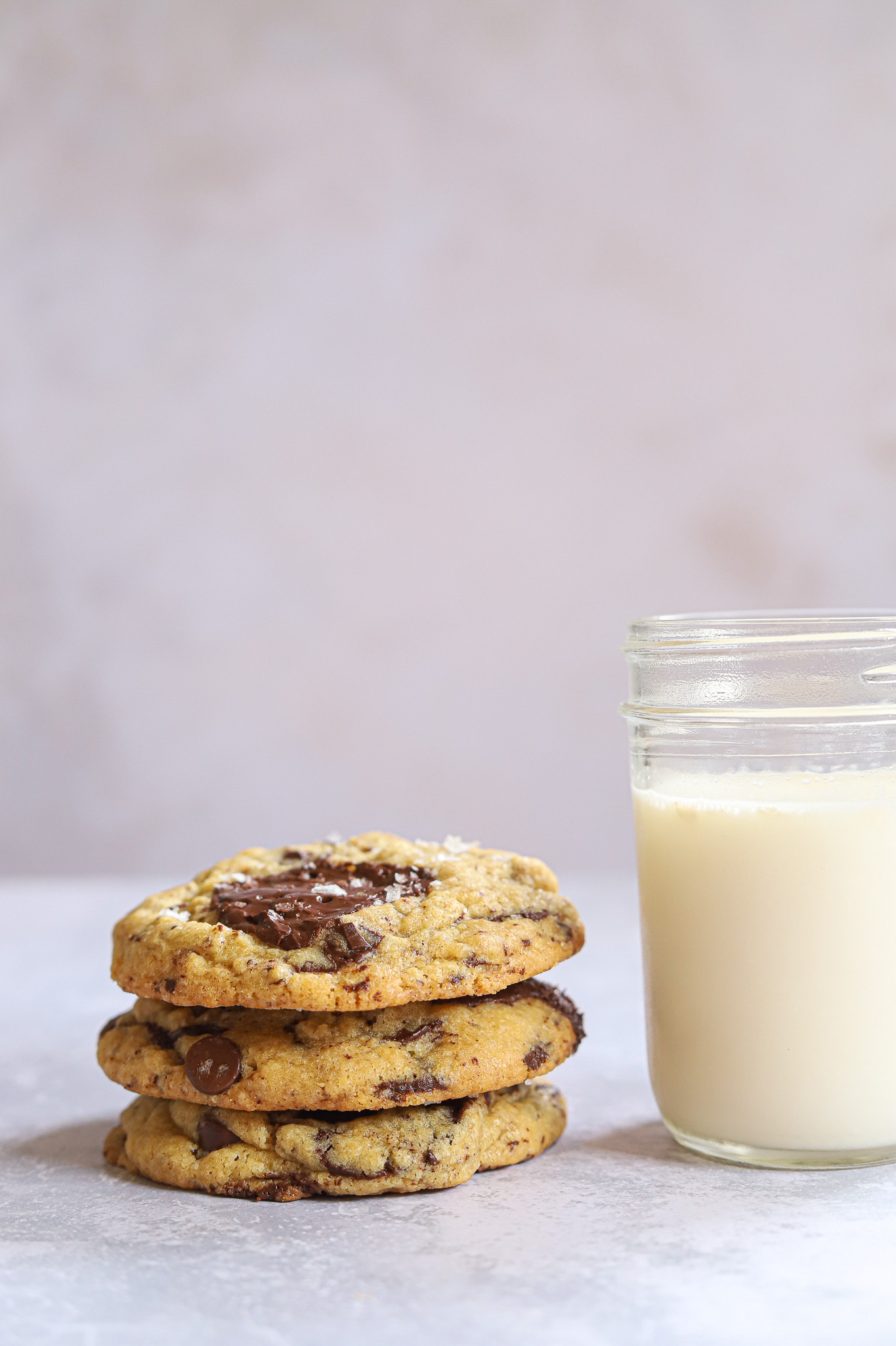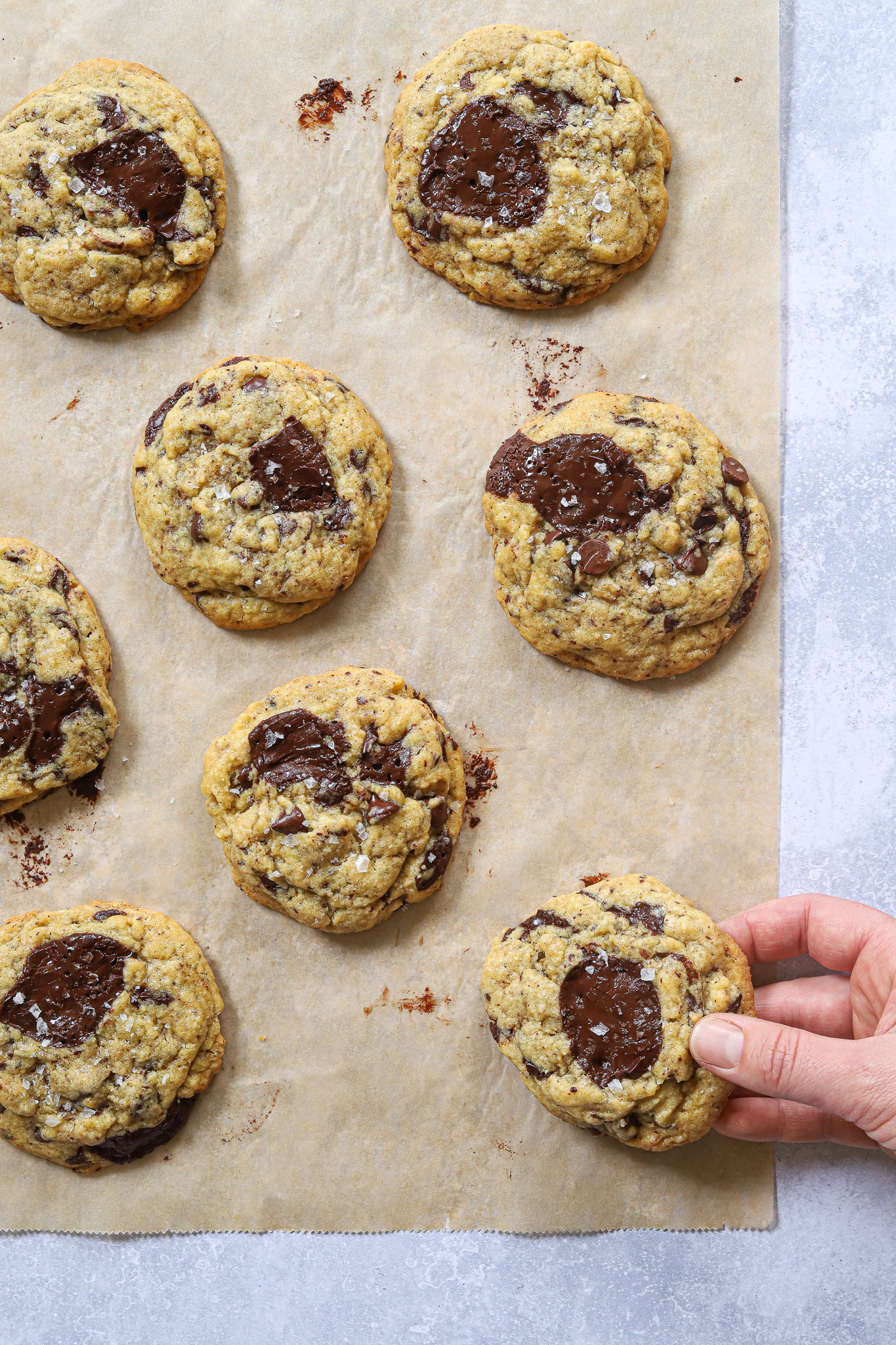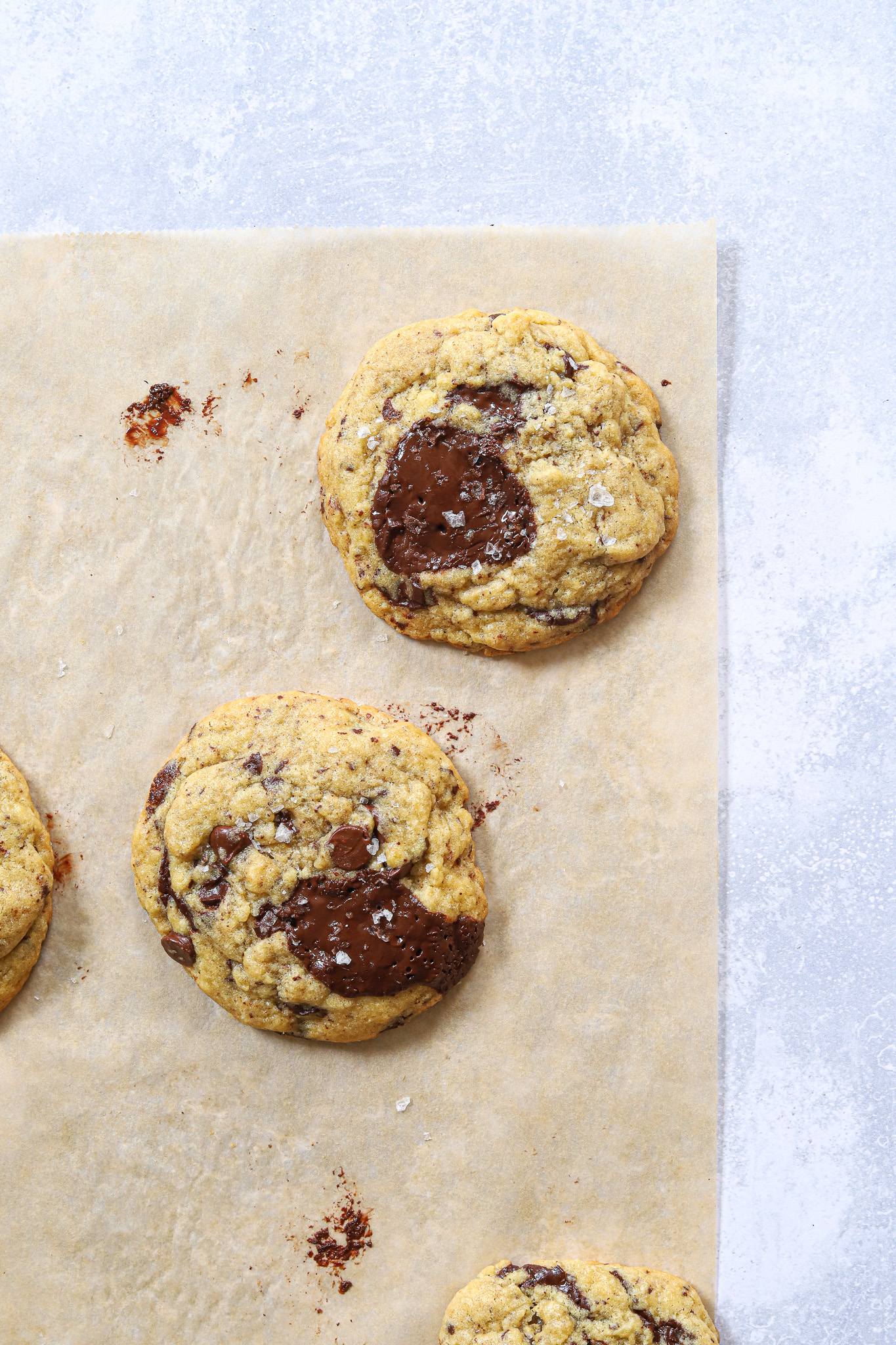 Preheat the oven to 325°F. Line a couple of baking sheets with parchment paper and place roughly 2 heaping tbsp-sized balls of dough evenly across the pans. Bake for 16-18 minutes, until the edges are golden brown but the centers are still quite blonde. Cool on the tray for 10 minutes, then transfer to a cooling rack. Enjoy!