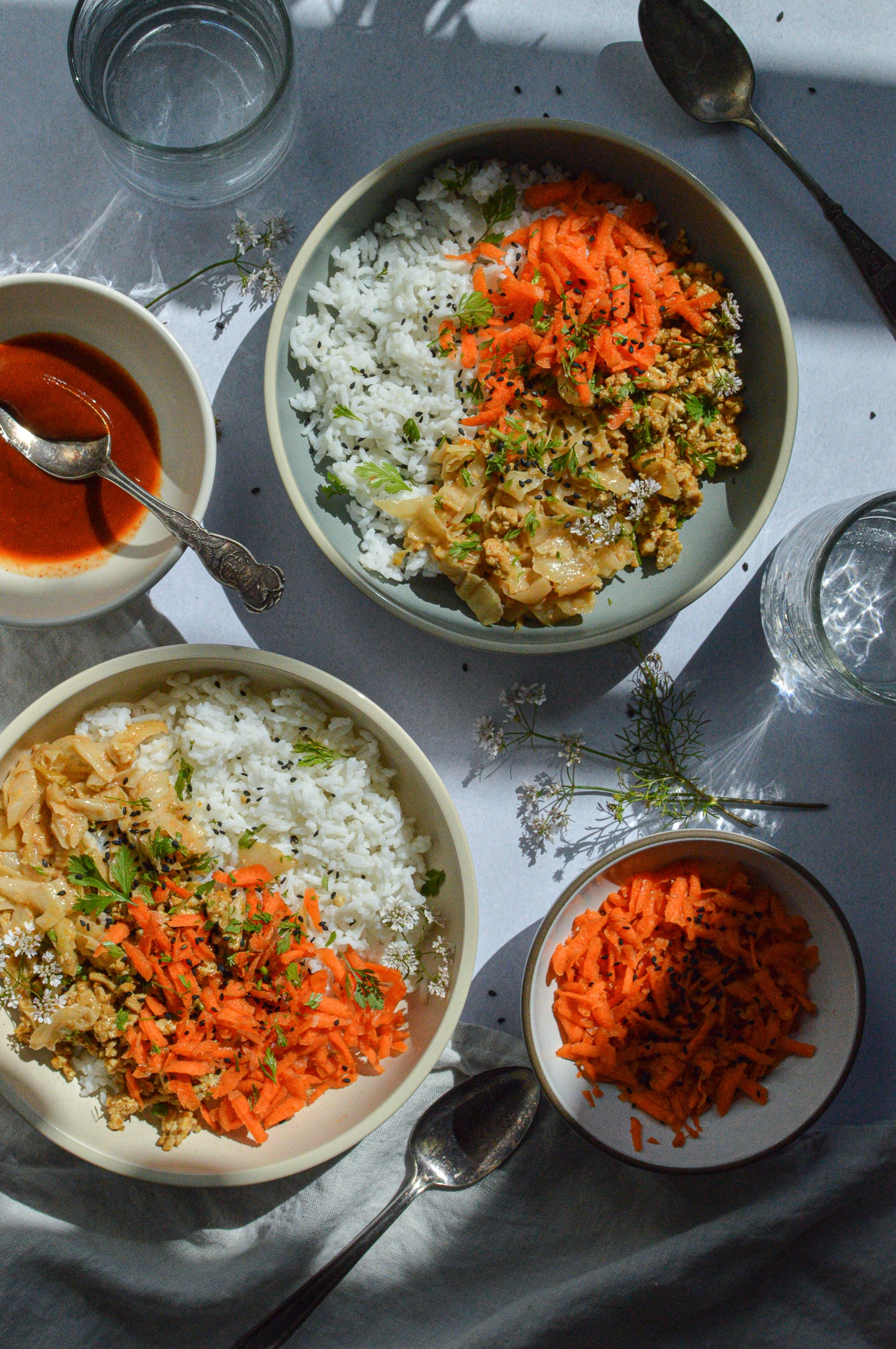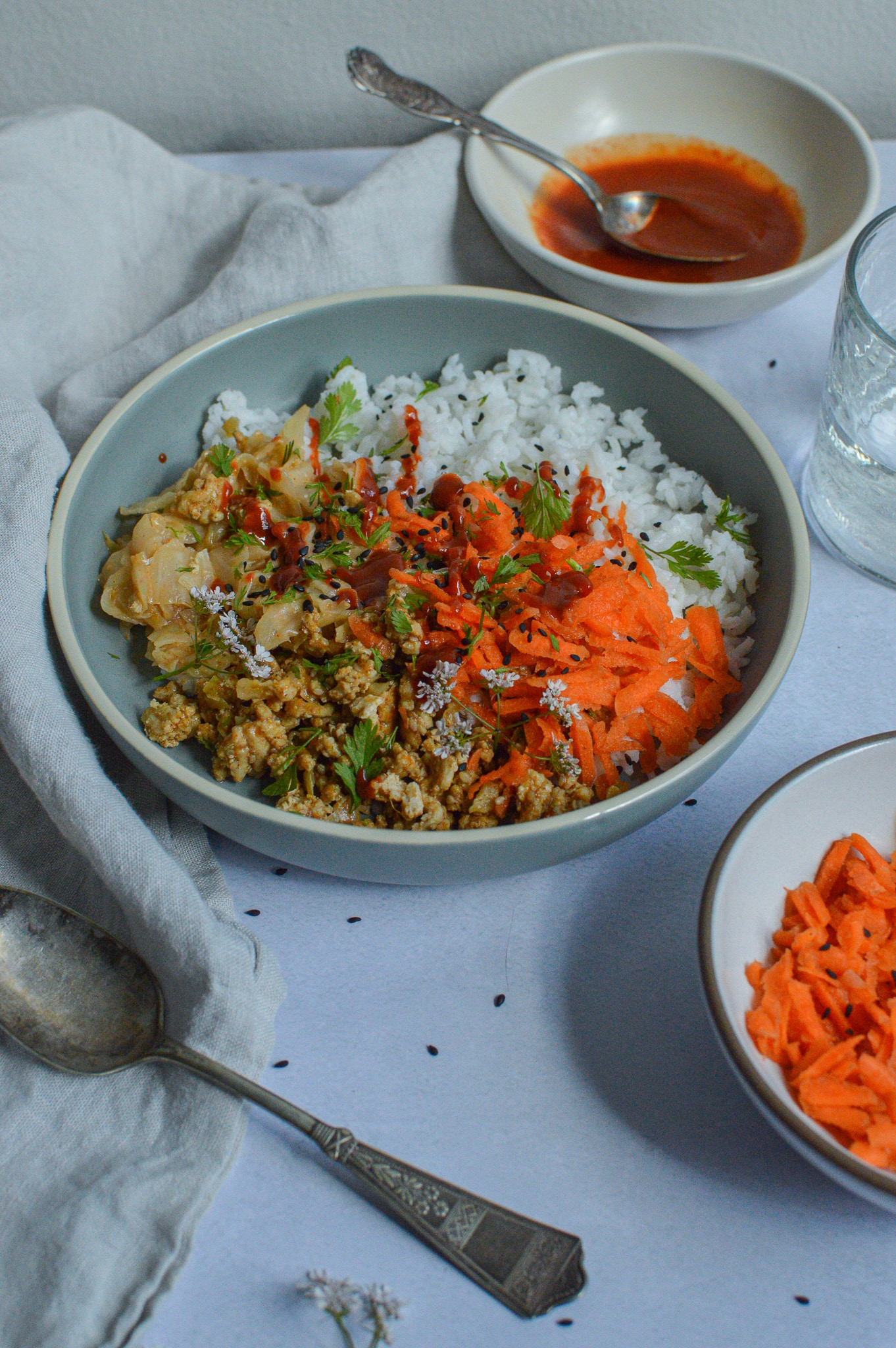 To serve: layer bowls with white rice, cabbage, then chicken. Top with grated carrot, cilantro, mushrooms (if using), and more sesame seeds. Bring the Gochujang bottle to the table with you. Enjoy!