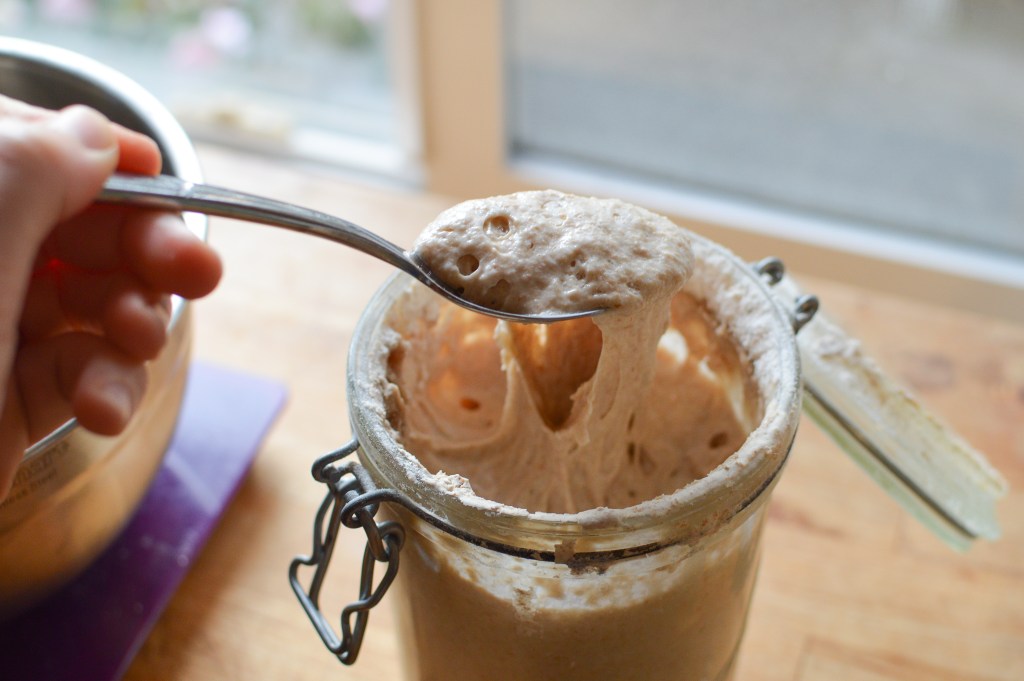 *Your starter is ready when it’s at least doubled in volume. If you want to make sure it’s ready, drop a small spoonful in a glass of water. If it floats, it’s ready. (If you leave it overnight, it should be good to go.)