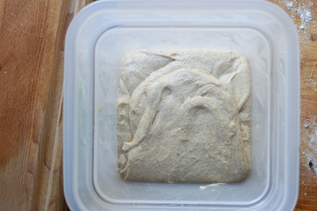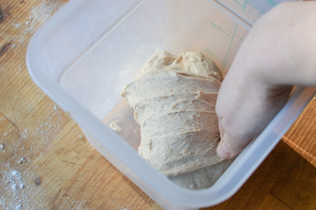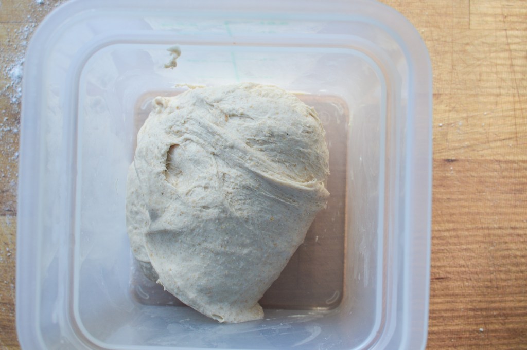 Place the mixed dough in a covered container or bowl (I like to use a professional food storage container with a lid). Leave to rest in a warm spot in your kitchen for 30 minutes. Every 30 minutes after that, perform a turn, meaning: lifting from the bottom, fold each corner of the dough over itself. Once you’ve completed at least 4 turns (2 hours) and up to 6-8 (3–4 hours), let the dough rest, covered, for 2-3 hours.