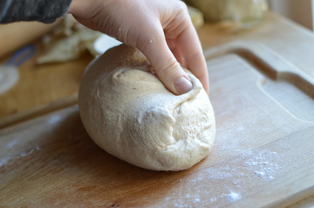 Complete the first shaping: turn the dough out onto a lightly floured surface. (Note that you’ll probably need a bench scraper to make your life easier with this step.) Pat the dough down into a rectangle and fold into your desired shape. For a round loaf, using both hands, fold the corners in, then roll, lift, and lightly stretch the dough until you have a relatively tight ball with a smooth top. For an oblong loaf, roll and press the short side of the patted rectangle towards you, using your thumbs to push the sides in as well. Seal the shape by pinching the seam together, and pat to get an even shape. Rest the dough, seam side down, under a damp kitchen towel for 20 min.