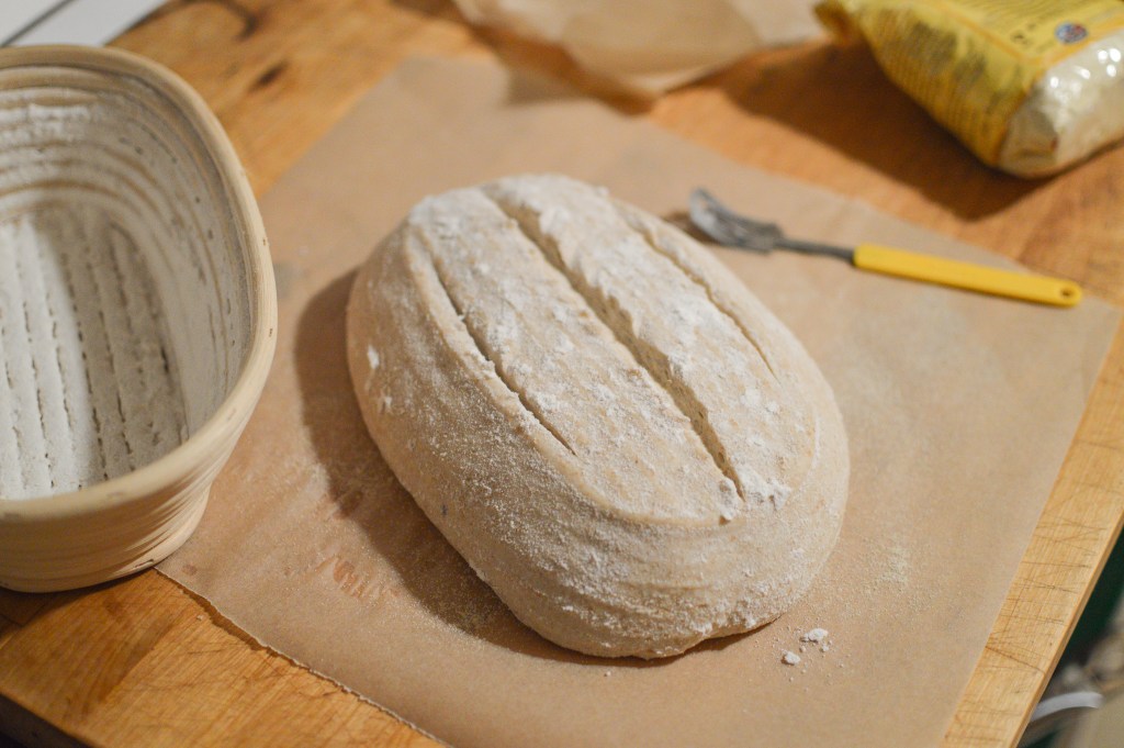 If you want freshly baked bread by midday or even a little earlier, you can start your bread the day before you want to eat it and simply extend the first or second resting period. To extend the first resting period: after you’ve completed your turns on day 1 and let the bread rise for 2–3 hours, put the whole thing, covered, in the fridge overnight. On the morning of day 2, take the dough out of the fridge and let it come back to room temperature, about an hour. Pick the process up where you left off by completing the first shaping. To extend the second resting period: when you’ve shaped your dough for the second time and placed it in its basket, let it rest, covered, for at least an hour before wrapping it well with a kitchen towel or two (not too tightly) to keep it moist while it’s in the fridge. The next morning, take the rested dough out of the fridge and let it come to room temperature—this should take 1-2 hours. At this point you’re ready to bake.