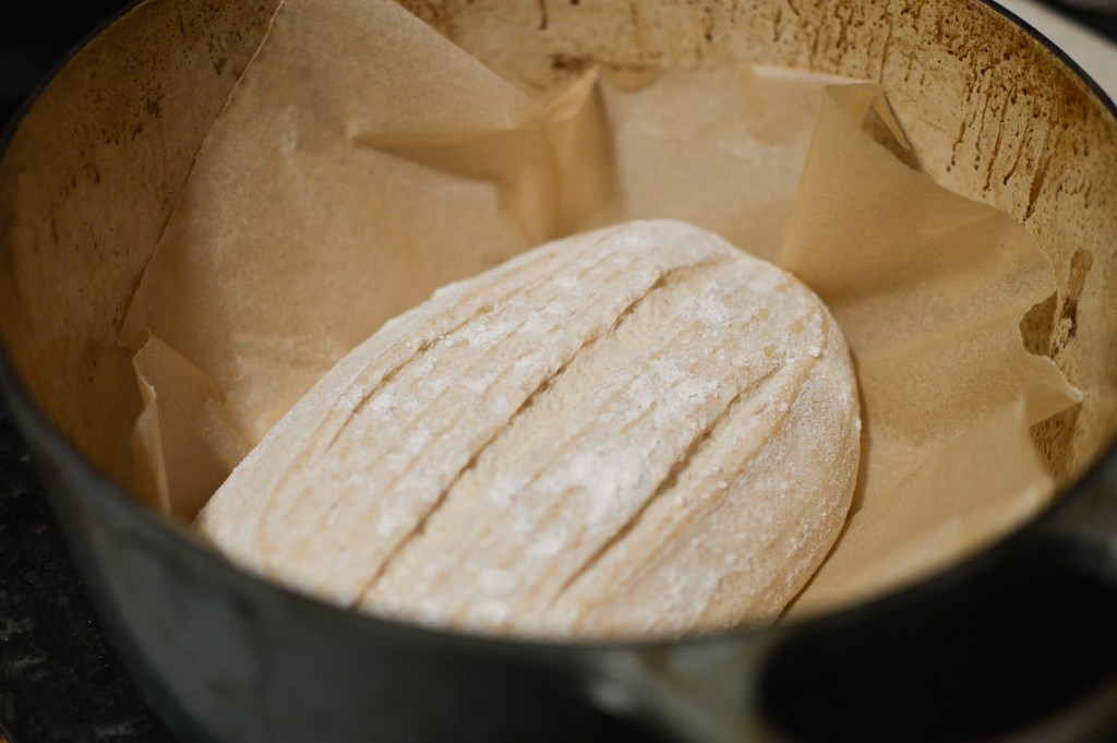 Boil a little water. Flour a large piece of parchment paper with a sprinkle of rice flour (or other flour). Once the oven is ready, turn your bread onto the floured parchment paper (seam side down) and score the top of the bread using whatever design you wish (I often default to one long slash—it’s easy and effective). To score, you can use a serrated knife, kitchen scissors, or a lame, which is essentially a tool made specifically for scoring bread that looks like a razor blade on a stick.