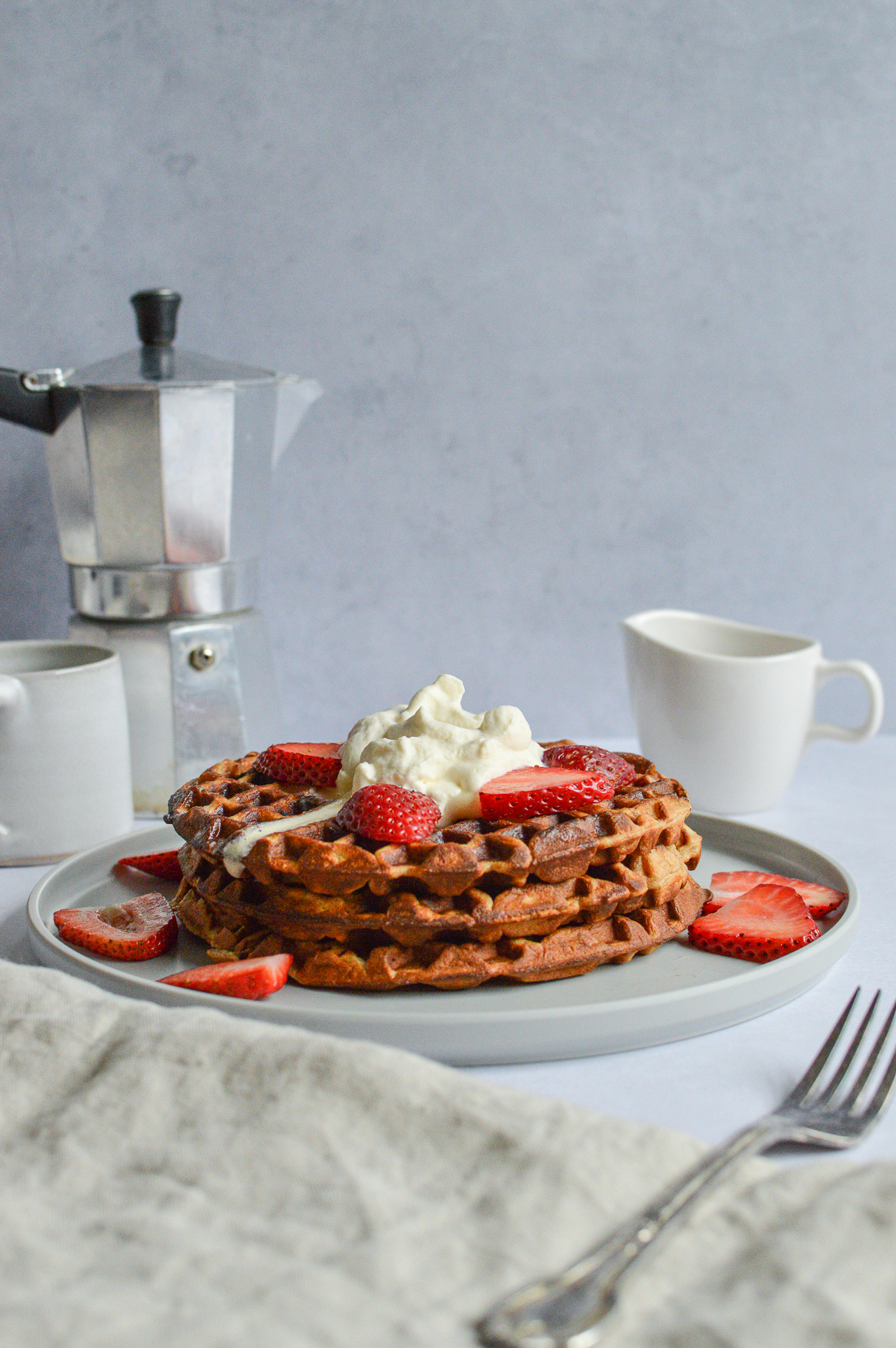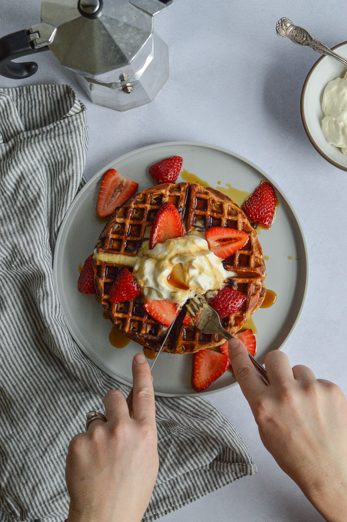 I believe we’re in the sixth week of our new shelter-in-place lifestyle (or has it been longer?), with plenty more to come. On the bright side, the cats could not be happier with the 24/7 attention. Jonji has been on a research block for the past week and half, which means he is now working from home with me until next week. We make a concerted effort to take more walks around the neighborhood, do workouts in our living room (without disturbing the downstairs neighbors too much, which adds to the challenge), and eat healthfully. Without people to share with, I haven’t been baking too much for fear of eating too much sugar ourselves. However, I did make these waffles three weekends in a row last month, and I regret nothing.