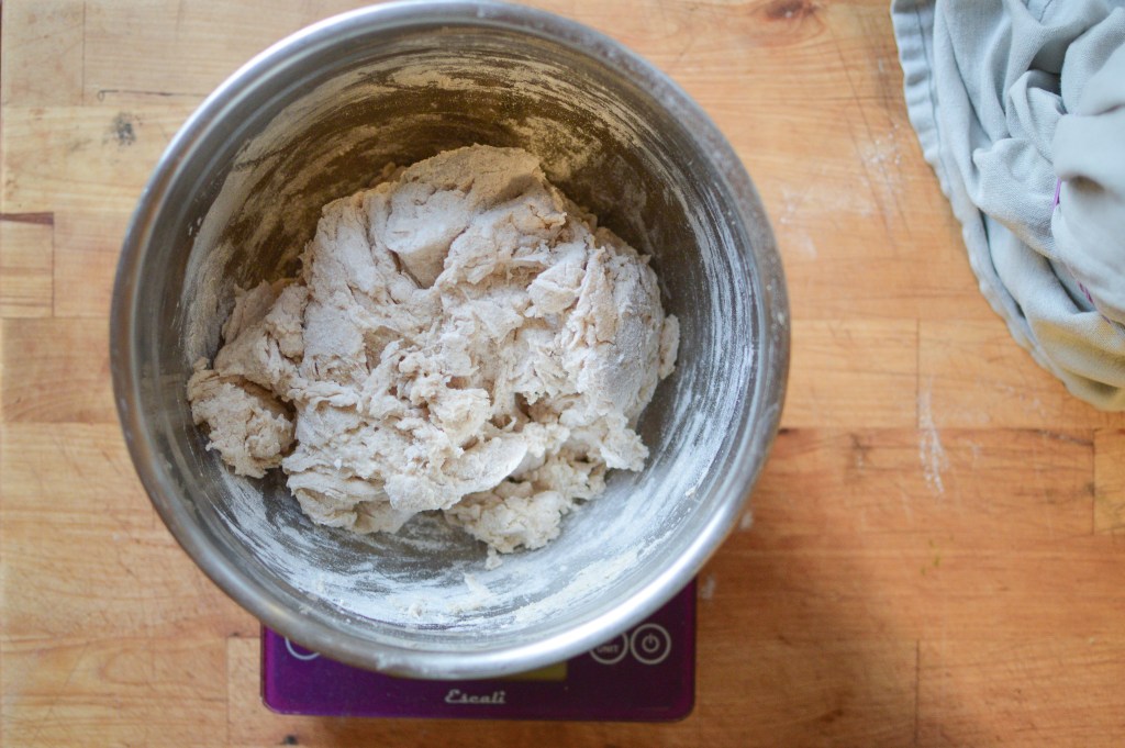 Feed your starter the night before, if temperatures are cool, or in the morning, if the day is warm. Scoop out all but about 1/4–1/2 cup of your old starter. Using a kitchen scale, pour 200g cool water into your container, then add your 200g 50/50 flour. Stir it all together well, making sure to incorporate the bits on the bottom. Put the lid on lightly (it needs air, so never fully close the lid) and cover with a kitchen towel and secure with a rubber band. Leave on the counter overnight, or for at least a few hours.*