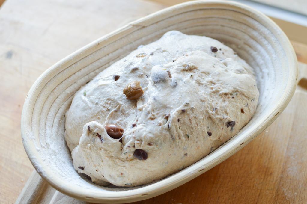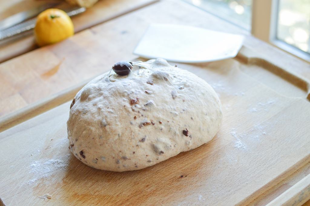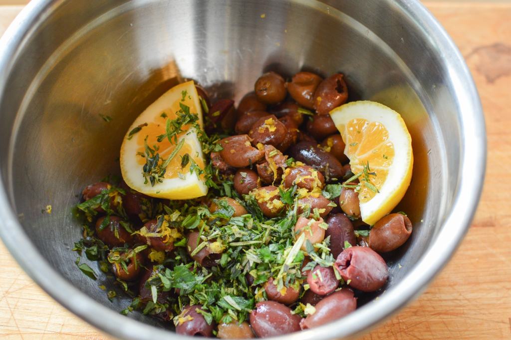 The night before you plan to make the bread (or a couple hours before, which is what I often end up doing), prepare the olives. Drain the olives and toss with the olive oil, lemon zest, and lemon juice. Toss in the juiced half lemon. Strip the herbs from their stems and chop the leaves (this can be pretty coarse), then stir the herbs into the olives. Cover and let it all marinade in the fridge over night or at room temperature if you’re making your bread on the same day.