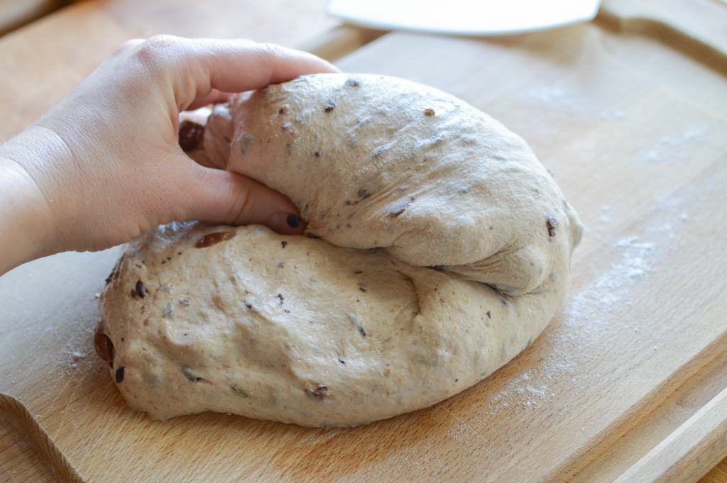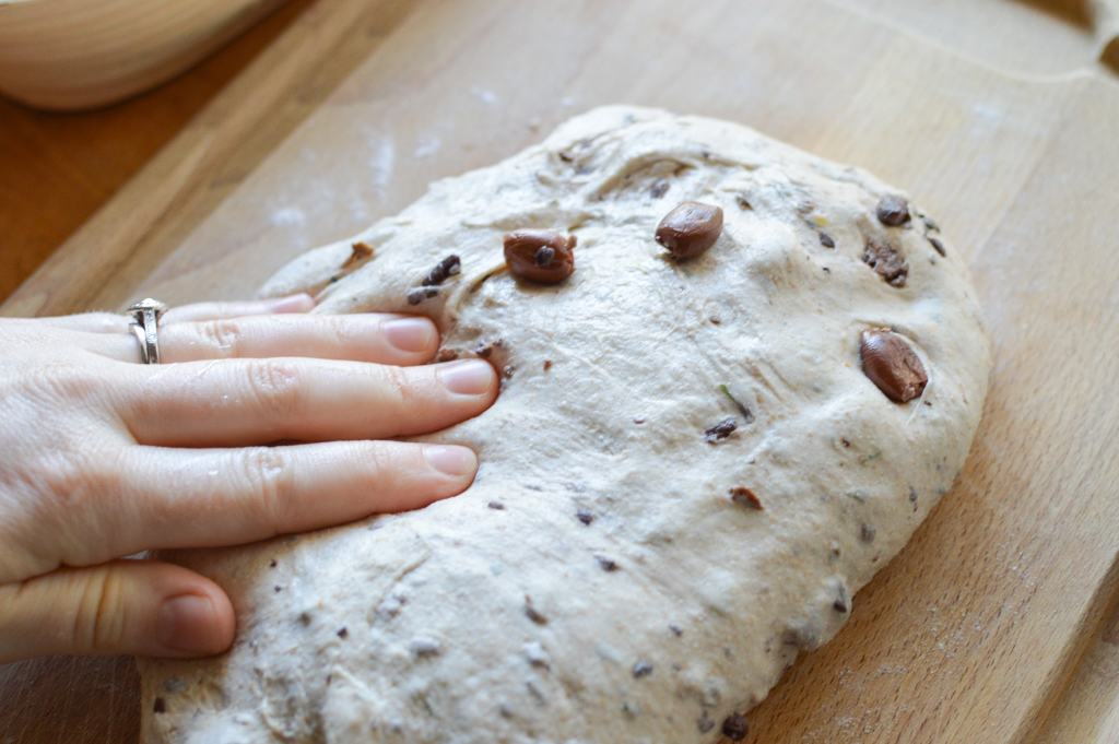 Place the mixed dough in a covered container or bowl (I like to use a professional food storage container with a lid). Leave to rest in a warm spot in your kitchen for 30 minutes. After that initial rest, add the olives. Drain the marinated olives of excess liquid and discard the lemon halves, then pulse 2/3 of the olives a few times in a food processor until you have a chunky tapenade. Scrape this into the dough container. Toss the remaining whole olives with a little semolina flour, if you have it (this allows for slightly easier incorporation into the dough), and scrape into the dough container. Knead the olives and tapenade into the dough as best you can, trying to distribute everything evenly. Don’t worry too much if the olives aren’t sticking to the dough at this point—they will get there eventually. Cover and set aside to rest.