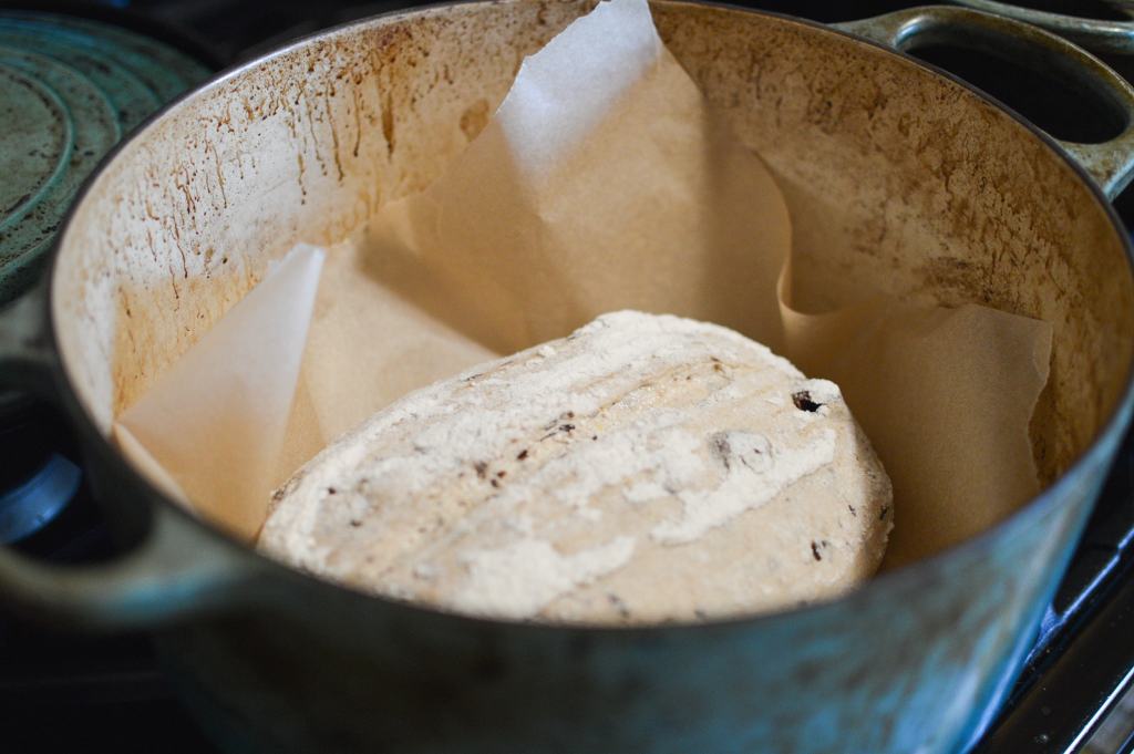 Carefully lower the bread on the parchment paper into the hot dutch oven. Quickly pour 1oz boiling water under the side of the parchment paper (not onto the bread). Immediately cover with the lid (watch out, the steam is hot!) and get it into the oven as quickly, and safely, as possible.