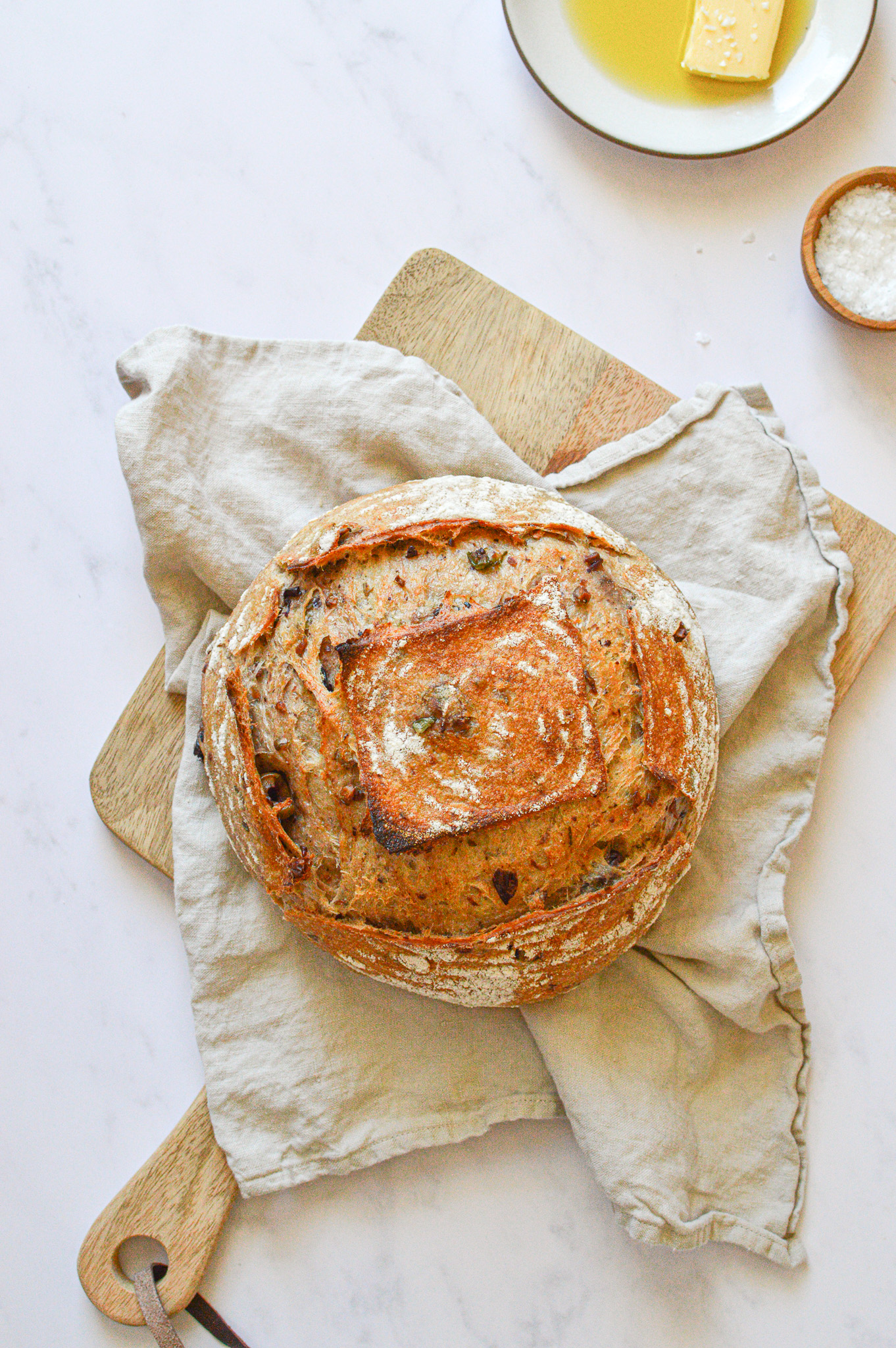 The oil from the olives and the marinade, coupled with the good quantity of herbs, makes this loaf tender and delicious. It’s the kind of bread you can’t help but eat when it’s still warm from the oven, slices torn apart and generously smeared with butter and dipped in olive oil. It also goes incredibly well with hummus. If you’re already making sourdough bread, I urge you to give this a try!