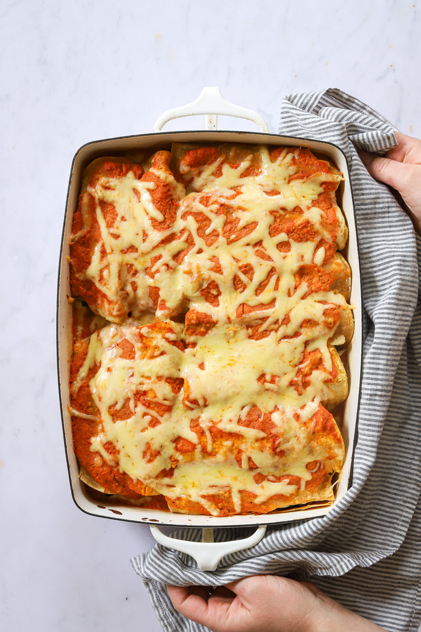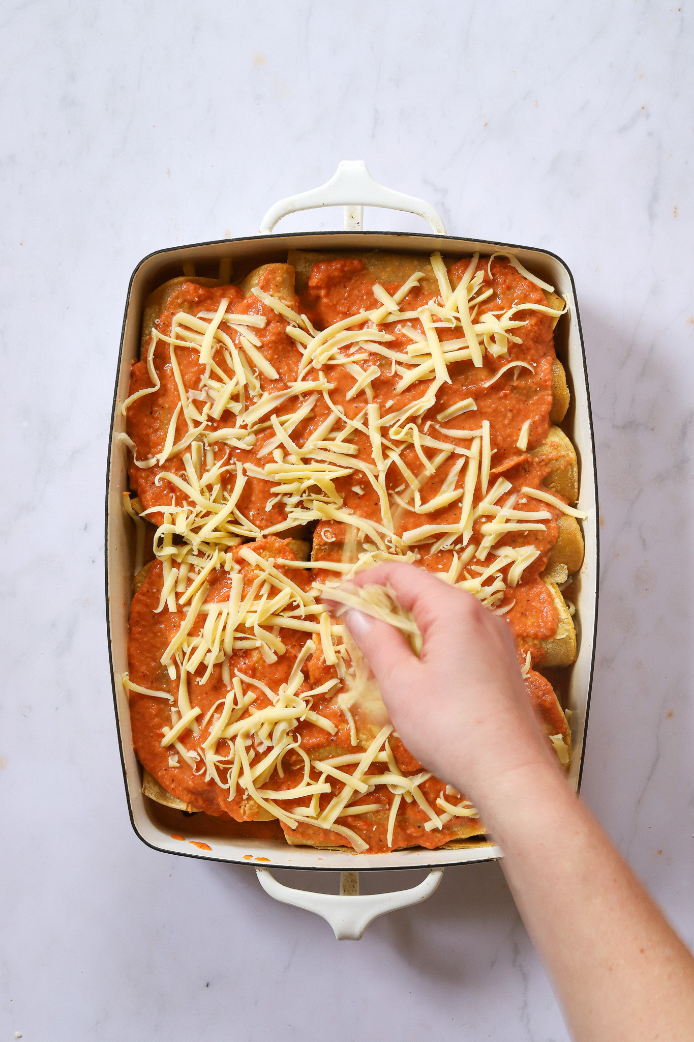 Pour the rest of the sauce evenly over the top of the enchiladas. Sprinkle the remaining cheese over that. Transfer to the oven and bake for 15-20 minutes, until the cheese has completely melted.