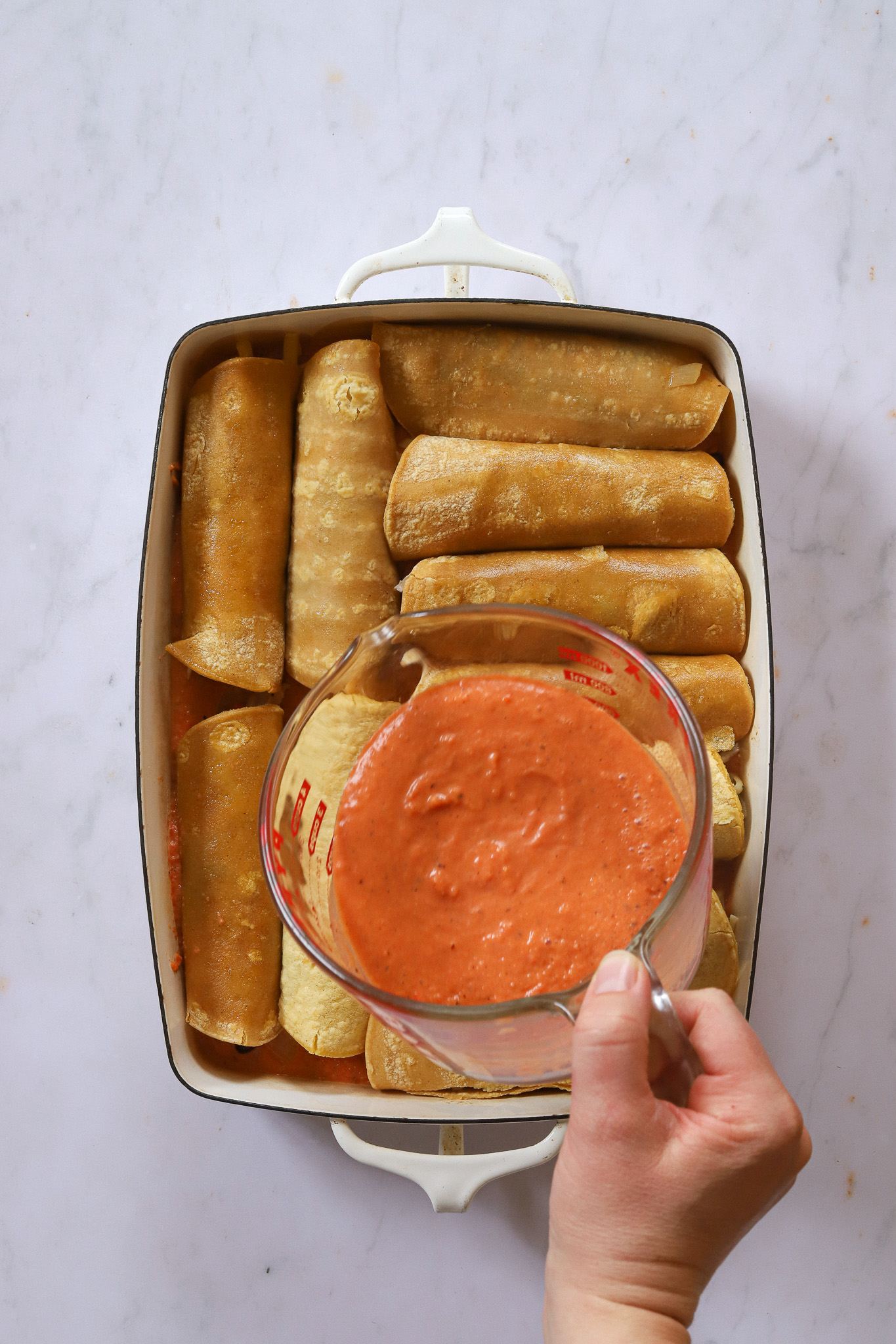 Spoon some of the vegetable, chicken, and cheese mixture into one tortilla (you’ll see how much you can fit depending on your tortilla, but I usually use about 1/2 cup per tortilla—you just want to be able to roll it so the filling doesn’t fall out). Roll the tortilla around the filling so there’s a little overlap, then carefully transfer the enchilada to the sauce-lined pan, seam side down. Push as close to the edge as possible—you’ll need all the room you can get. Repeat with the remaining tortillas and filling, fitting at least 10, but ideally 12, in the pan. You may have a little extra filling, which I sometimes sprinkle around the enchiladas or save for later.