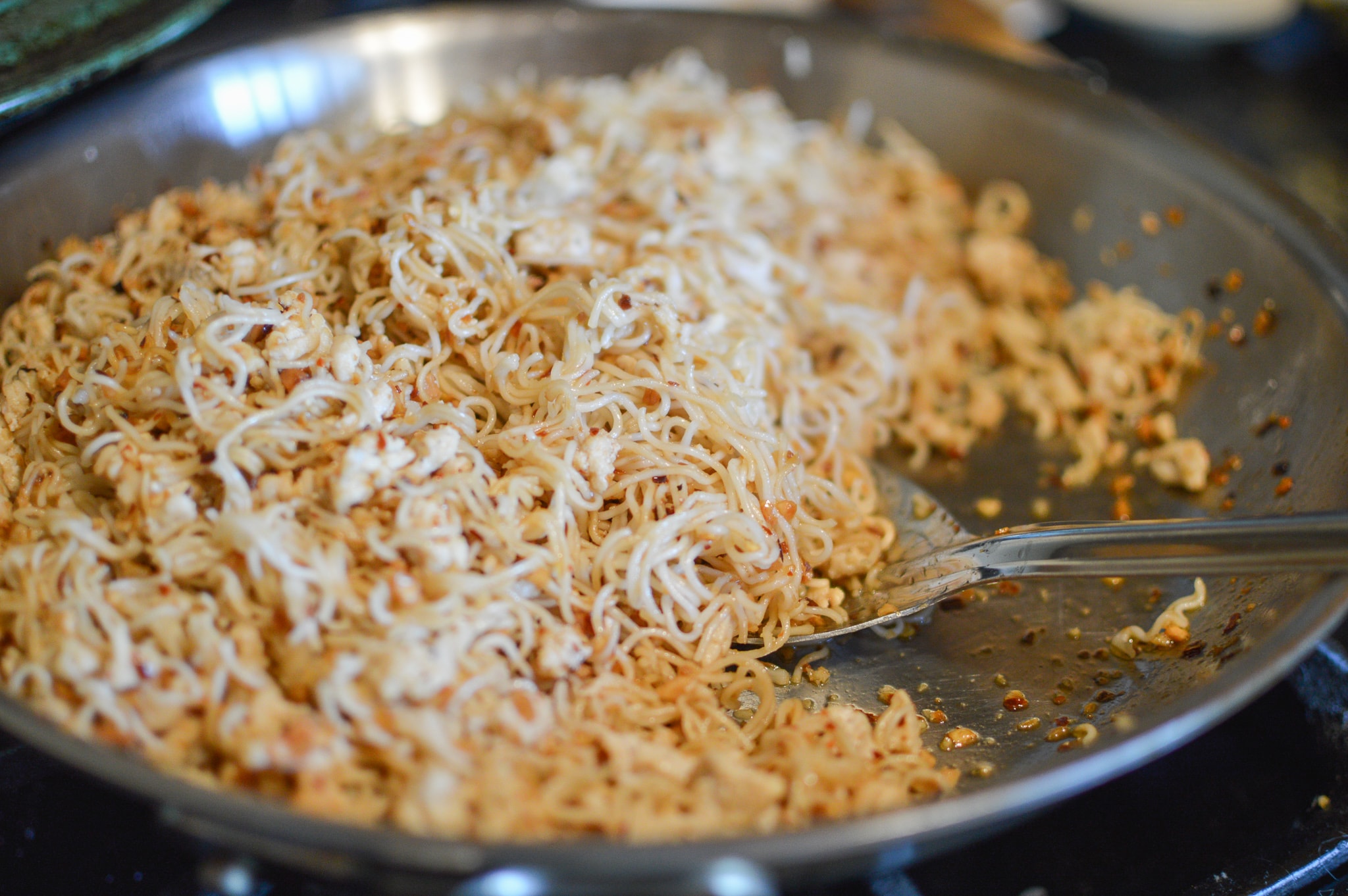Discard the orange rind, then mix the bowl of spicy peanut oil into the ground chicken. Stir in the ramen noodles and coat everything thoroughly in the oil. Stir in the bok choy.