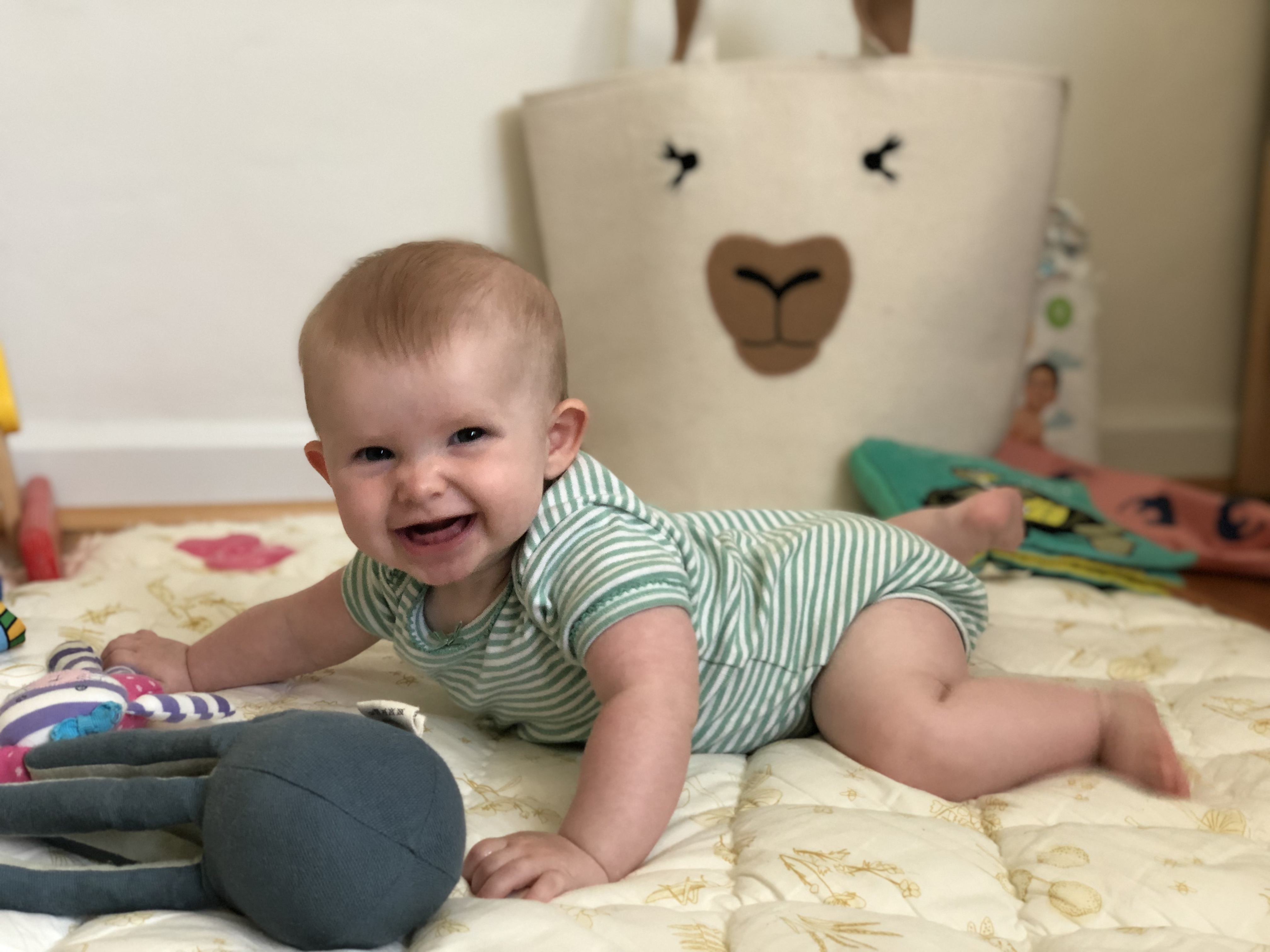Of course, I don’t actually get to devote that much time to any of my hobbies, with Phoebe dominating my days. She’s six months old now, a real person who smiles and laughs and cries for reasons other than being hungry or tired. She loves spending time outside, staring in wonder at passing butterflies, grabbing any leaves she can reach, and grasping at blades of grass with all of her fingers and toes. She loves the cats, grinning in the way that makes her little nose scrunch up and making an excited “kchhhh” sound whenever she catches sight of them. All animals at play make her laugh, and she loves interacting with dogs, her hands coming up around their sniffing snouts as if she can’t believe her eyes. Her favorite teether is a piece of celery (a fresh one every day, I’m not a monster), and she sometimes likes to eat mashed avocado, banana with nut butter, or homemade applesauce with puréed spinach. She can roll over, sit on her own, and stand assisted, little legs locked and a look of pure glee on her face. She now has one tooth. She’s a joy.