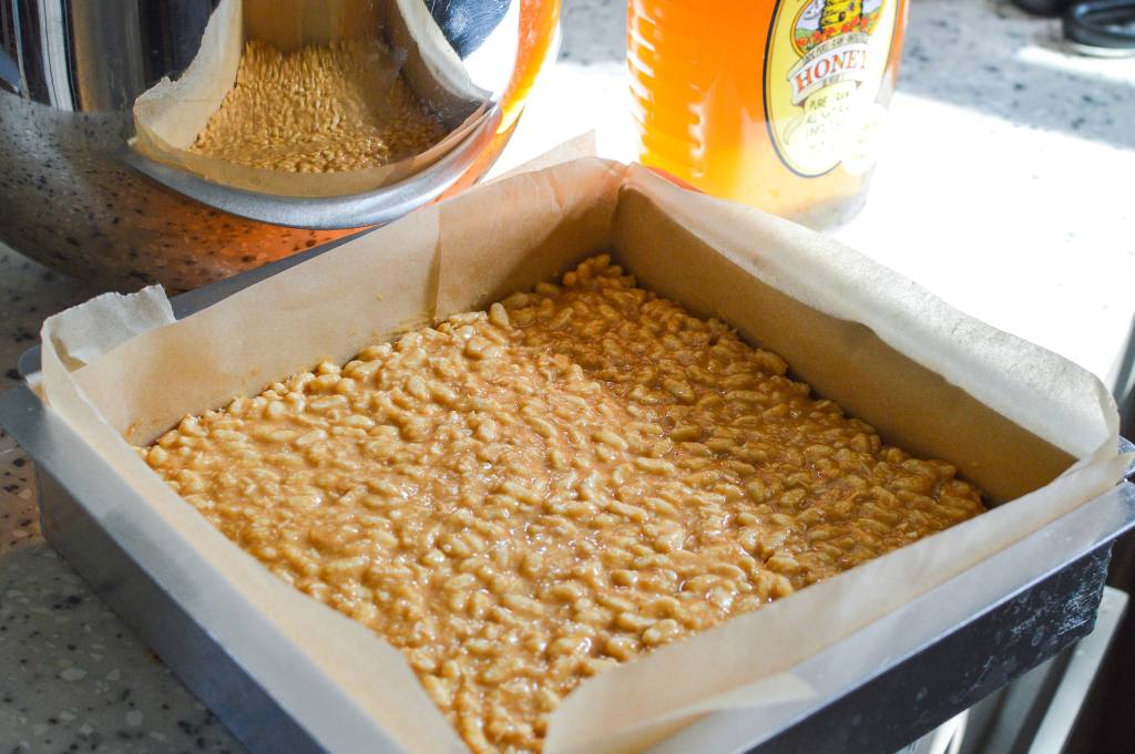Heat the peanut butter, butter, and honey together in a large pot over medium heat. Once the butter has melted, stir until everything’s mixed together, and then add in the puffed rice, a pinch of salt, and shredded coconut (if using). Stir until it’s all thoroughly mixed, then scrape into your 8×8 inch tin and pat down until you have an even surface (this is easiest with a small offset spatula).