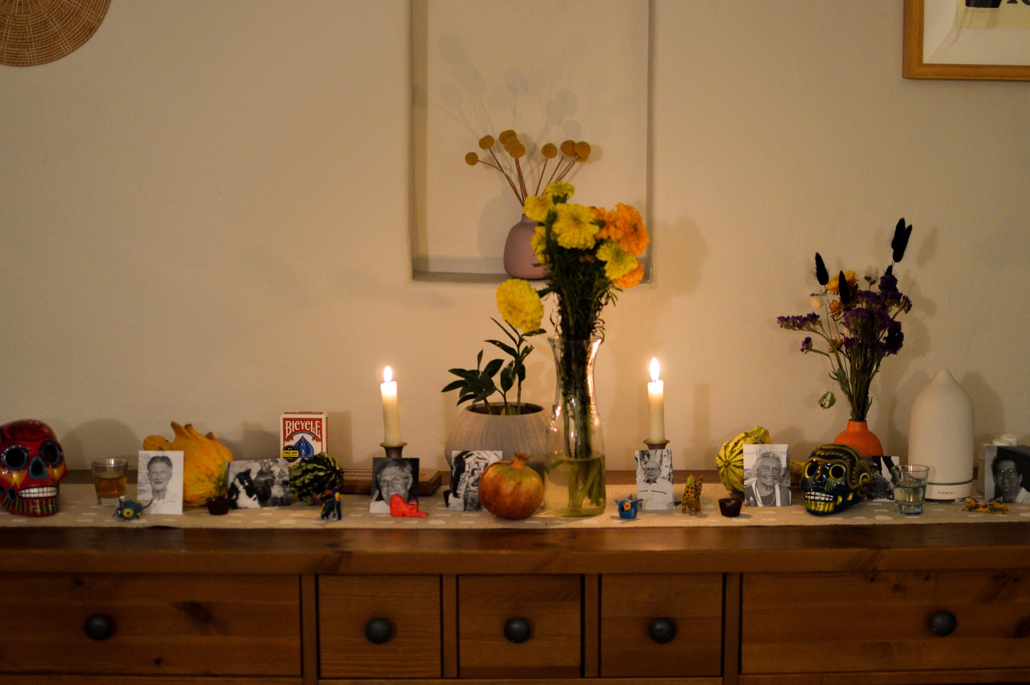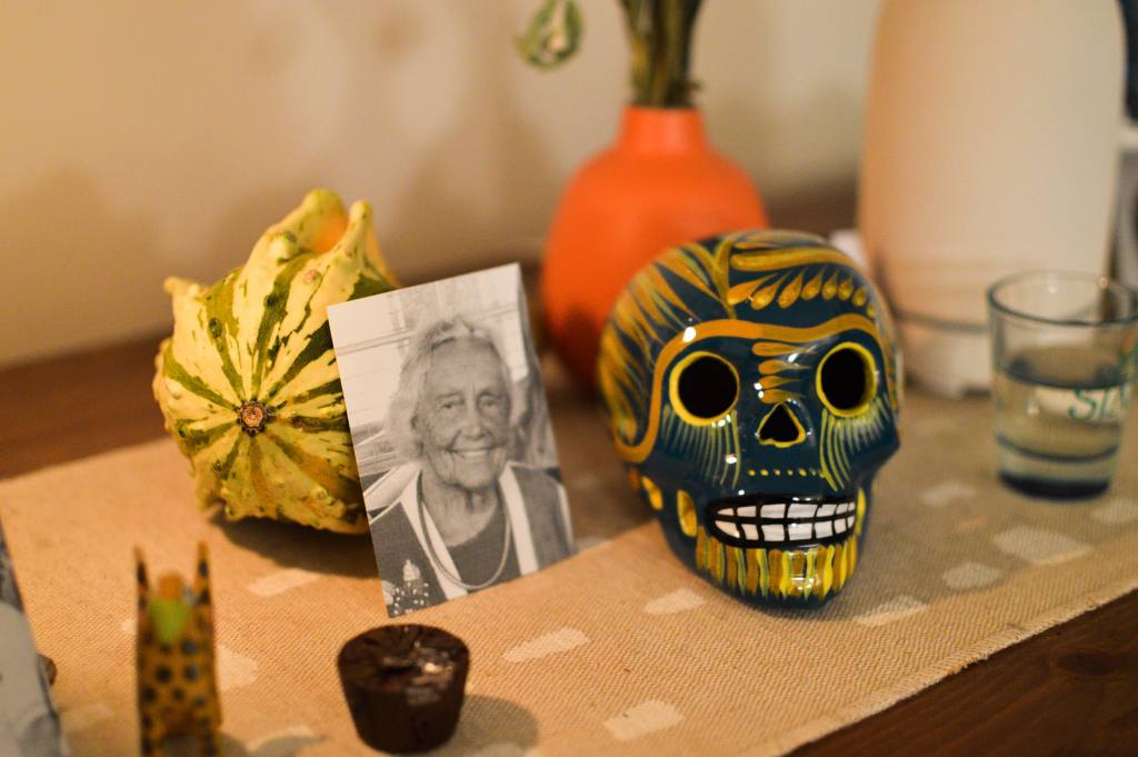 This year, for the first time, Jonji and I put together an ofrenda (altar) for Dia de los Muertos. We bought two ceramic skulls from the little Mexican-owned shop around the corner, each painted with swooping lines and brightly blooming flowers, along with a few more alebrijes to join the three that Jonji brought home from Oaxaca ten years ago. I printed photos on our home printer, rendering all of our loved ones in black and white (I didn’t get organized early enough to get them officially printed), and cut each out with careful precision. Finally, we scattered a few morsels, shots of whiskey and gin, and a ready cribbage game among the skulls and colorful animals. In the middle of the altar sat a bouquet of cheerful marigolds. That night we lit the candles, and from amidst the soft glow, those we love and miss smiled back at us: Daddad, Granny, Johnny John, Grandma Barber, Grandpa Barber, one of Jonji’s beloved patients, Leetle and Tito (a couple of our deceased family cats) and, our most recent loss, Uncle Don. Smiling, we recalled memories for each.