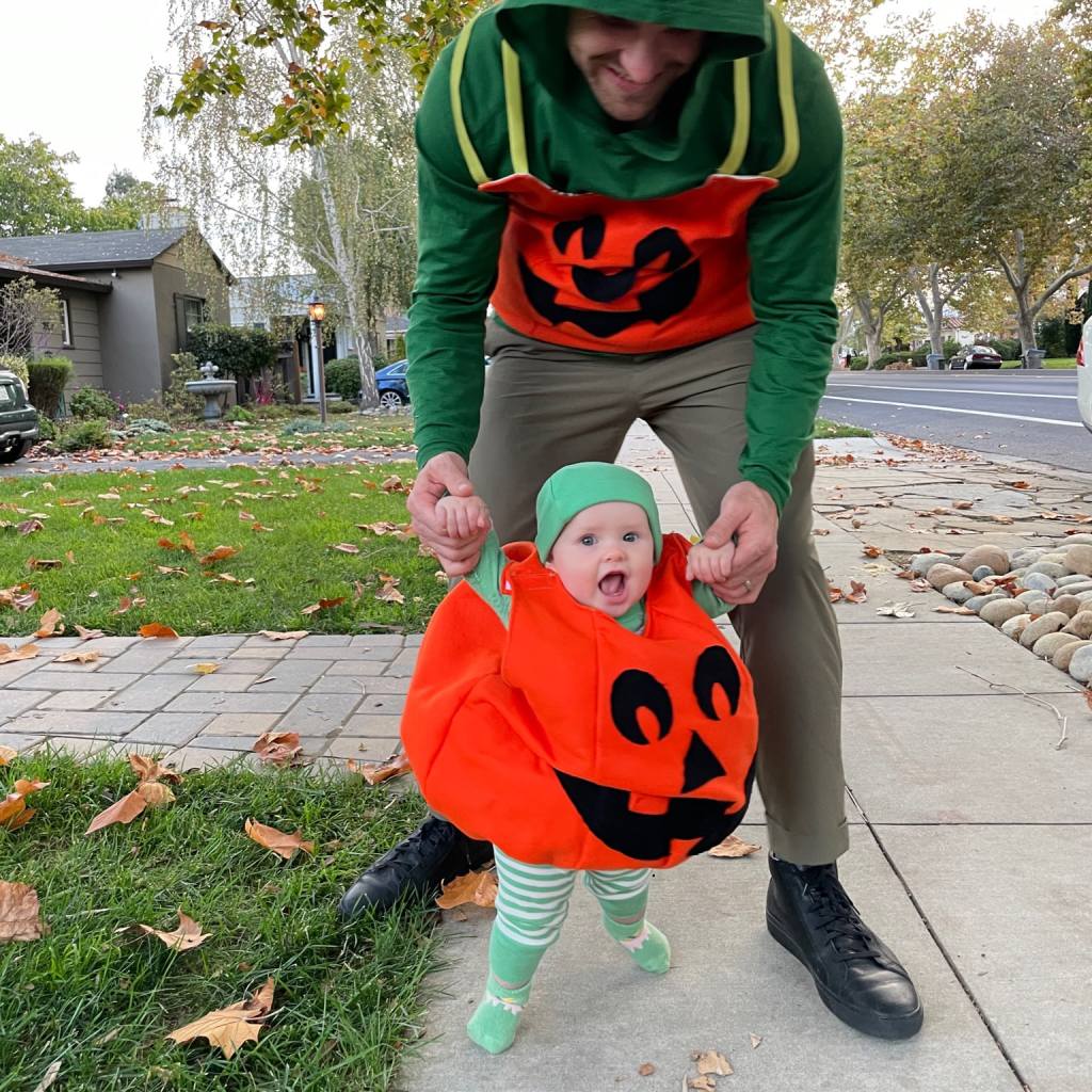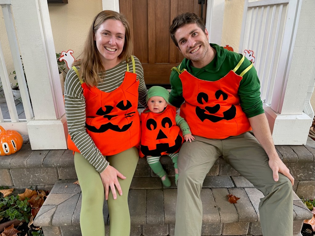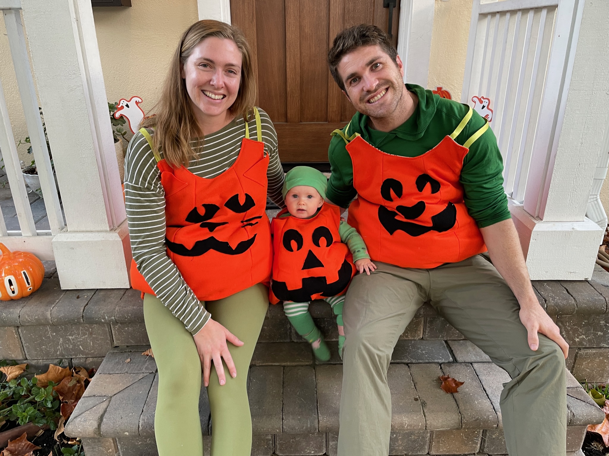 We brought Phoebe out trick-or-treating with Riley (well, Riley did the trick-or-treating while Phoebe watched from our arms). I took on the task of making her costume, which turned into me making costumes for all three of us. Since I’d only purchased one pattern, Jonji and I ended up wearing big toddler costumes, which somehow made them even better. I sat bent over my failing sewing machine for hours, stitching bright orange felt into a cohesive shape. We ended up looking quite fantastic, three puffy pumpkins strolling through the neighborhood. Phoebe was the cutest little orange puffball and when she walked, holding tight to Jonji’s fingers, the costume rotated around her, emphasizing her adorable waddle.