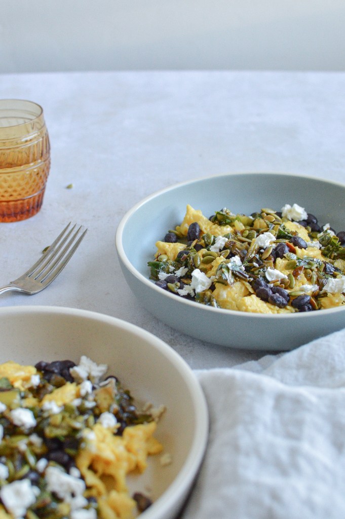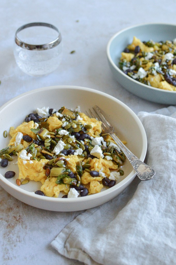 Scrambled Eggs with Black Beans, Salted Pepitas, & Scallion Salsa