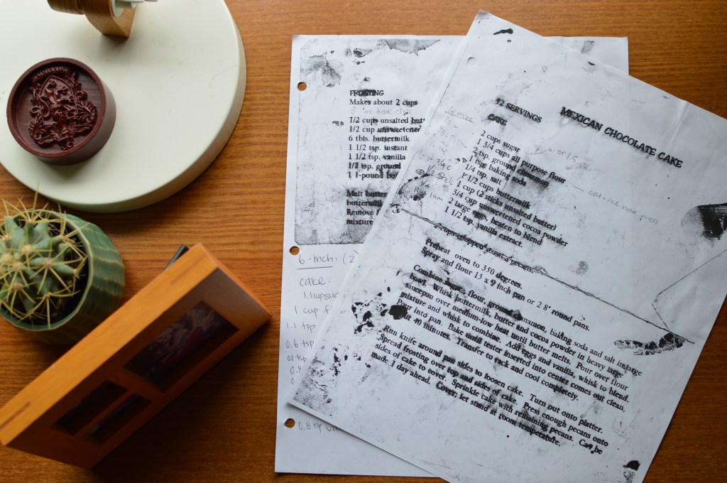 Emma never stopped loving that gelato combination, and she was consistently happy with her choice of birthday cake. She’s much more adventurous as an adult, but I know she’d never be able to resist a slice of this cake. A tender chocolate cake with a hint of warmth from the cinnamon and covered with sweet, cinnamon-mocha frosting, it’s one of the only cakes I gladly eat more than a few bites of. It’s the one cake I return to over and over because it’s, quite simply, always a joy to eat. It’s also probably the first cake I baked myself, smaller me poring over the stained, chocolate-smudged pages of my mom’s old recipe, typed up and printed for her by her long-time friend Carolyn. My photocopied version, hole-punched and placed in a binder of recipes Mom sent me off to college with, retains all the wear and tear of the original.