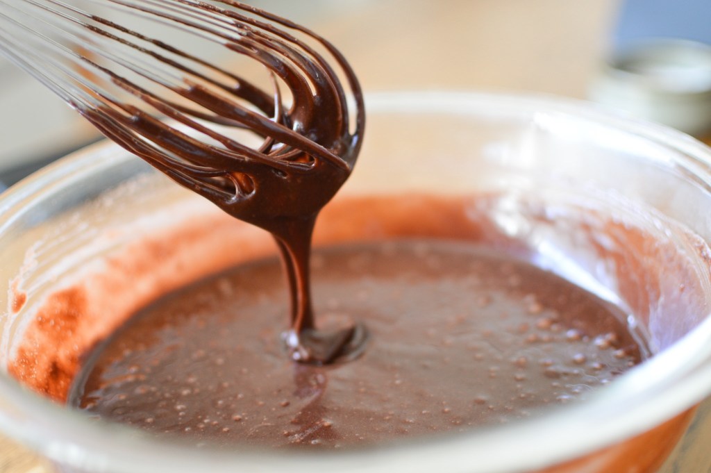 Preheat oven to 350°F. Butter (or use a non-stick spray) two 8-inch round cake pans. Dust the pans with cocoa powder, turning and tapping to ensure the cocoa powder coats the entire interior surface of each. If you want an especially easy turn-out experience, line the bottoms with parchment paper.