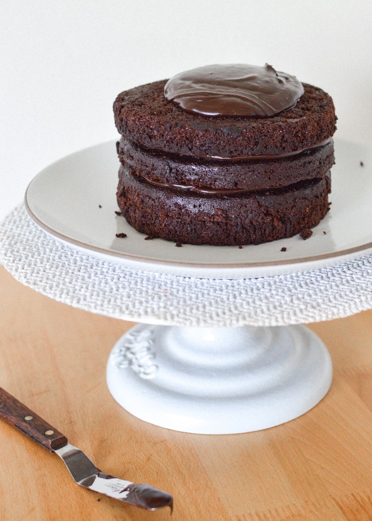 To ice the cake: To make four layers, cut each cake in half horizontally as equally as you can (a bread knife and a rotating cake stand are great tools for anyone who likes to make cakes). Dab a little frosting on whatever surface your cake will reside on to ensure the cake sticks and doesn’t slide around. Place your bottom layer on the cake plate or cake board* and spread a large dollop of frosting on top of the layer. You want each frosting layer in between to be enough to separate the cake layers, but not so much that you won’t have enough to ice the outside—if you’re doing two layers only, you can have more in the middle. If doing four layers, repeat the frosting process until you place the last piece on top.**